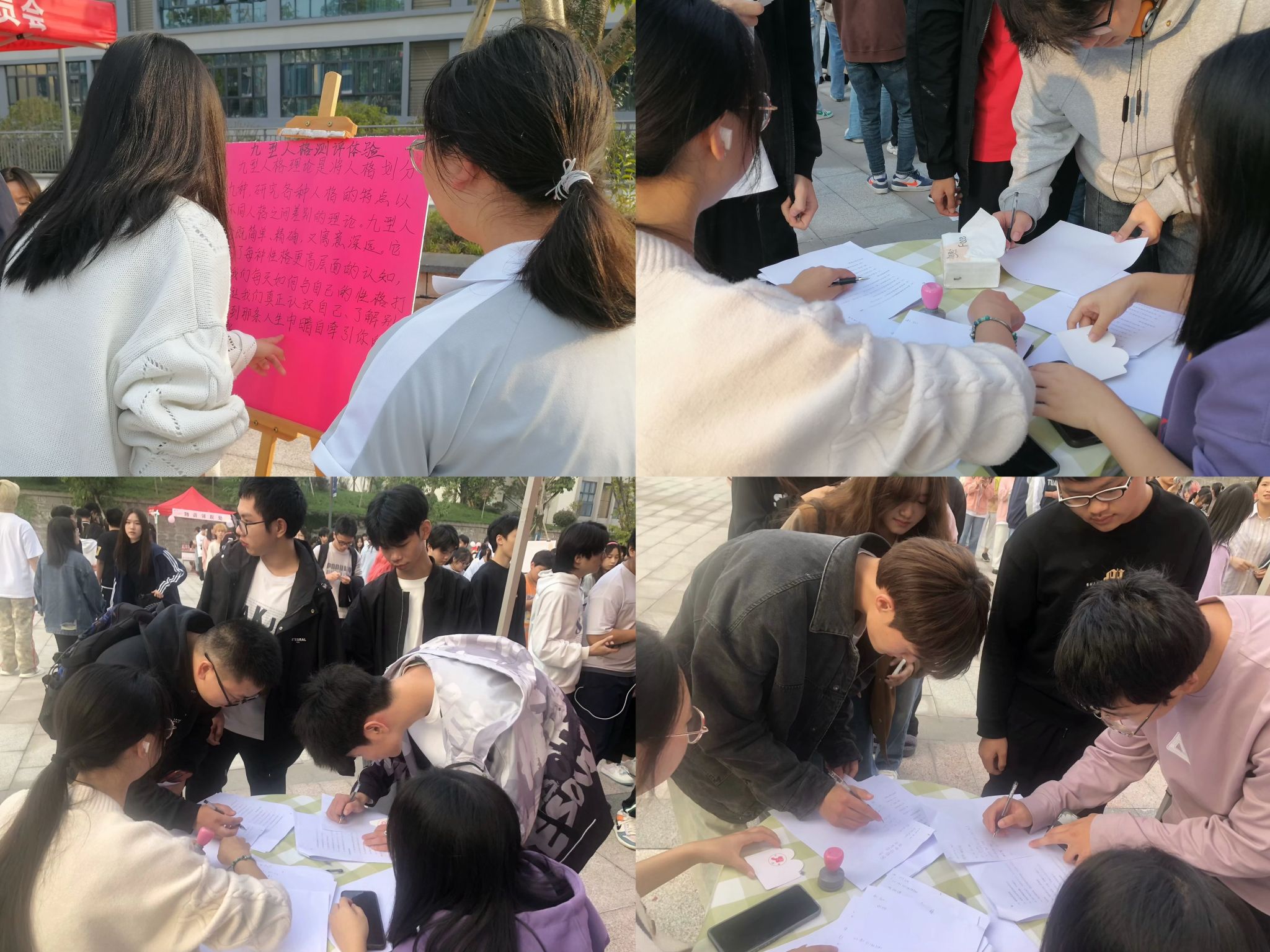 镜头移至广场,每个活动位点都热闹非凡。作为最广为人知的“e人”与“i人”,在活动一开始就吸引了大量同学的关注。外倾性人格的同学善于与他人互动,以开朗的性格与较强的表达能力,组团进行彩绳争夺。而内倾型人格的同学则喜爱独处思考,选择了投壶,纵使周围声音此起彼伏,但是他们依旧可以很专注。来到“神秘汤之谜”解密区域,逻辑型与情感型人格的同学们携手合作,共同解密一个复杂的推理故事。逻辑型同学认真地分析线索,构建逻辑框架,而情感型同学则凭借直觉和情感洞察力,为解密过程注入了温暖和情感。当两者成功找到故事的关键线索时,他们相视一笑,那种默契和成就感溢于言表。判断型与知觉型人格的同学们就俄罗斯方块进行了激烈比拼。判断型人格的同学有条不紊地将方块归位。而知觉型人格的同学喜欢随性发挥,灵活变通。进入瞬息蝶影快计环节,实感型同学凭借细致的观察和分析能力,认真地记着工作人员说过的每一条信息。而直觉型同学则凭借直觉和洞察力,抓住关键信息点迅速做出判断。
