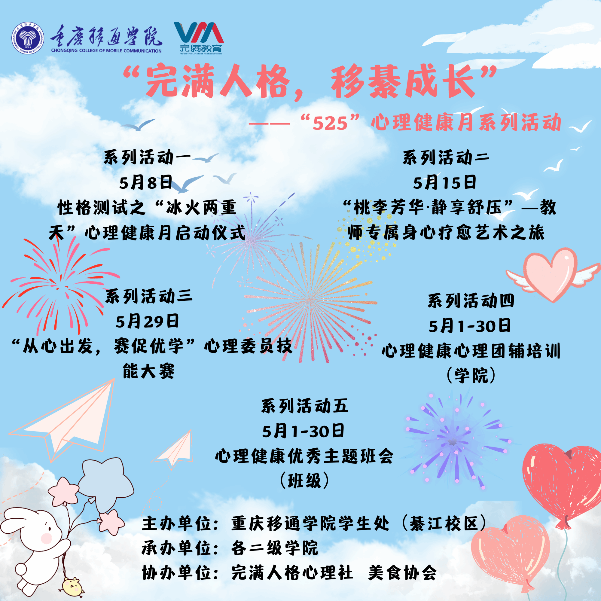 编者按:5月为我校心理健康月,“5.25”意在呼吁全体师生“珍惜生命,关爱自己”。本次“5.25”心理健康月系列活动,从完满人格实践、教师艺术疗愈工坊、心理委员技能比拼等多个方面呼吁全体师生关注身心健康,培养积极心理品质,挖掘自身潜能。系列活动涵盖学校-学院-班级-个人四级心理网络,宣传和普及心理健康知识的同时为师生提供一个互动交流的平台,促进师生情感交流,增加良好的情绪体验,营造良好的校园心理文化氛围。