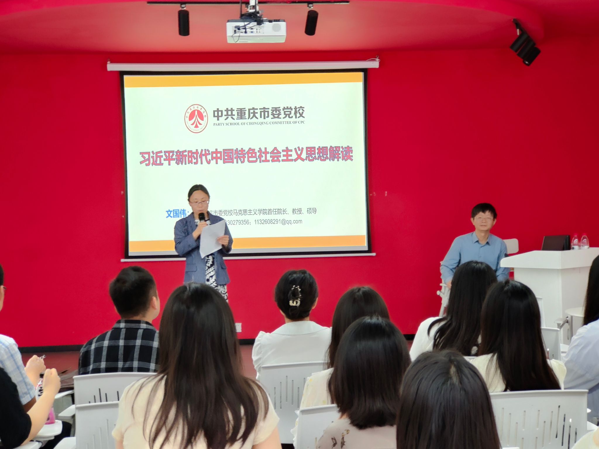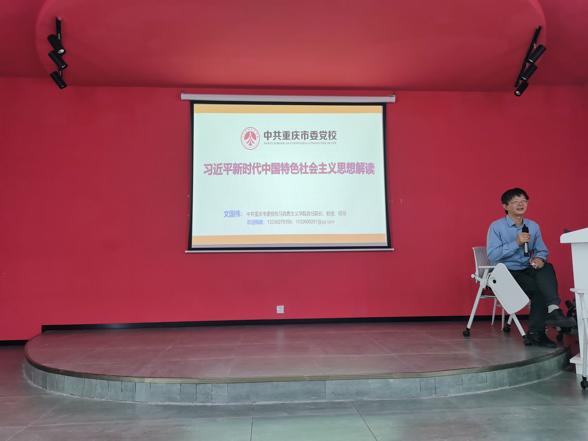 为深入学习贯彻习近平新时代中国特色社会主义思想,教育引导思政课教师在学思践悟中提高理论素养,坚定理想信念,增强能力本领,坚定拥护“两个确立”、坚决做到“两个维护”。4月17日下午,马克思主义学院(綦江校区)特邀中共重庆市委党校马克思主义学院首任院长文国伟教授于玉棠书院Talk King演讲中心开展“习近平新时代中国特色社会主义思想解读”理论学习活动。此次活动由马克思主义学院副院长唐孝庆主持,马克思主义学院(綦江校区)全体教师共同参与学习。
