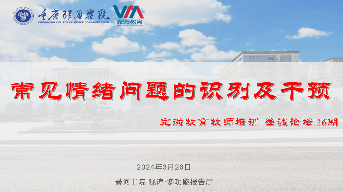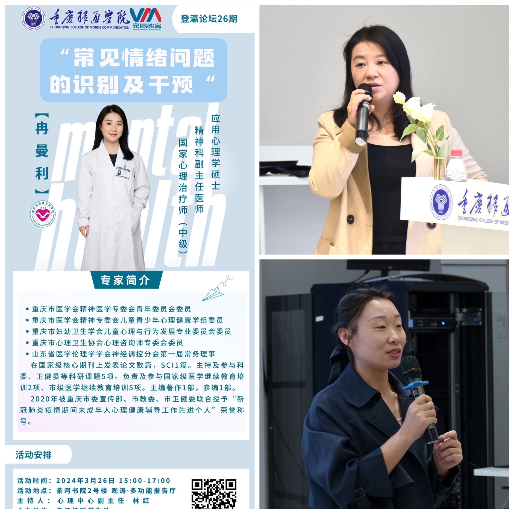为切实加强我校心理健康教育工作体系建设,提高学工队伍、异科导师等在常见情绪问题识别及危机处理方面的能力,减少或避免因心理问题引发的伤害事件,营造积极良好的心理健康氛围。3月26日下午15:00,由学生处主办的第26期登瀛论坛“常见情绪问题的识别及干预”专题讲座在綦河书院观涛·多功能报告厅举行,重庆市精神卫生中心精神科专家、应用心理学硕士冉曼利担任主讲人。讲座由心理中心副主任林红老师主持,綦江校区完满教育系统老师、异科导师到场参培。