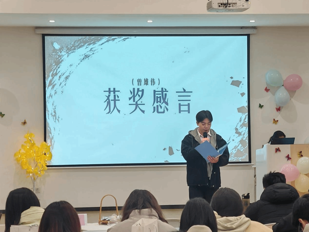 本次散文颁奖典礼不仅是对优秀作者的嘉奖,更是对散文文化的传承与发扬,引导社会风气向着更加健康、和谐的方向发展。为此,綦迹创意文学社、綦迹文化产业工作室为散文获奖者特别准备了特色文创奖品与荣耀证书,由王晓煊、田宗霖、杨文浩、周老师、萧婷婷老师依次为优秀、三等、二等、一等奖获得者颁奖。获奖代表人员曾雄伟同学上台领奖并发布了自己的获奖感言,这场颁奖典礼是对他们辛勤付出的肯定,也是对他们文学才华的赞誉。在每一篇成功的散文背后,都承载着移通学子的心血,是他们用对生活的感悟与理解写出了这一篇篇优美的散文。