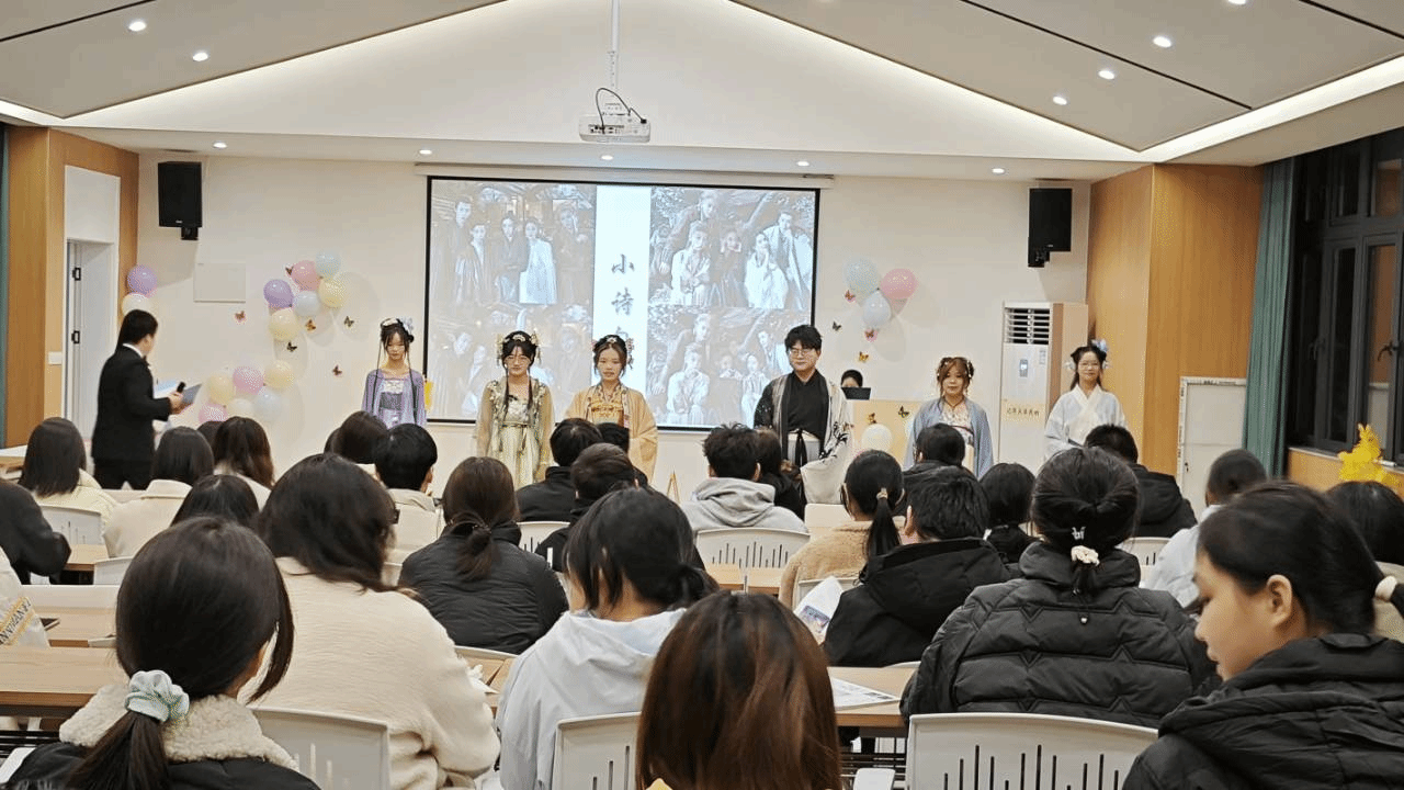 在开展本次活动前期,散文征集便陆续收到300余份优美的散文投稿,经过綦迹创意文学社的筛选,各位评委严格评选,最终选出了20份优秀的散文代表。颁奖典礼由华韵汉服协的汉服走秀舞蹈:“小诗句”开场,她们穿着华丽的汉服从典礼的两侧入场,步伐庄重而优雅,优美的舞姿与汉服融合。这一场古风韵味与细腻温婉的结合作为开场,让现场的同学见证了古韵与散文的交织与碰撞。