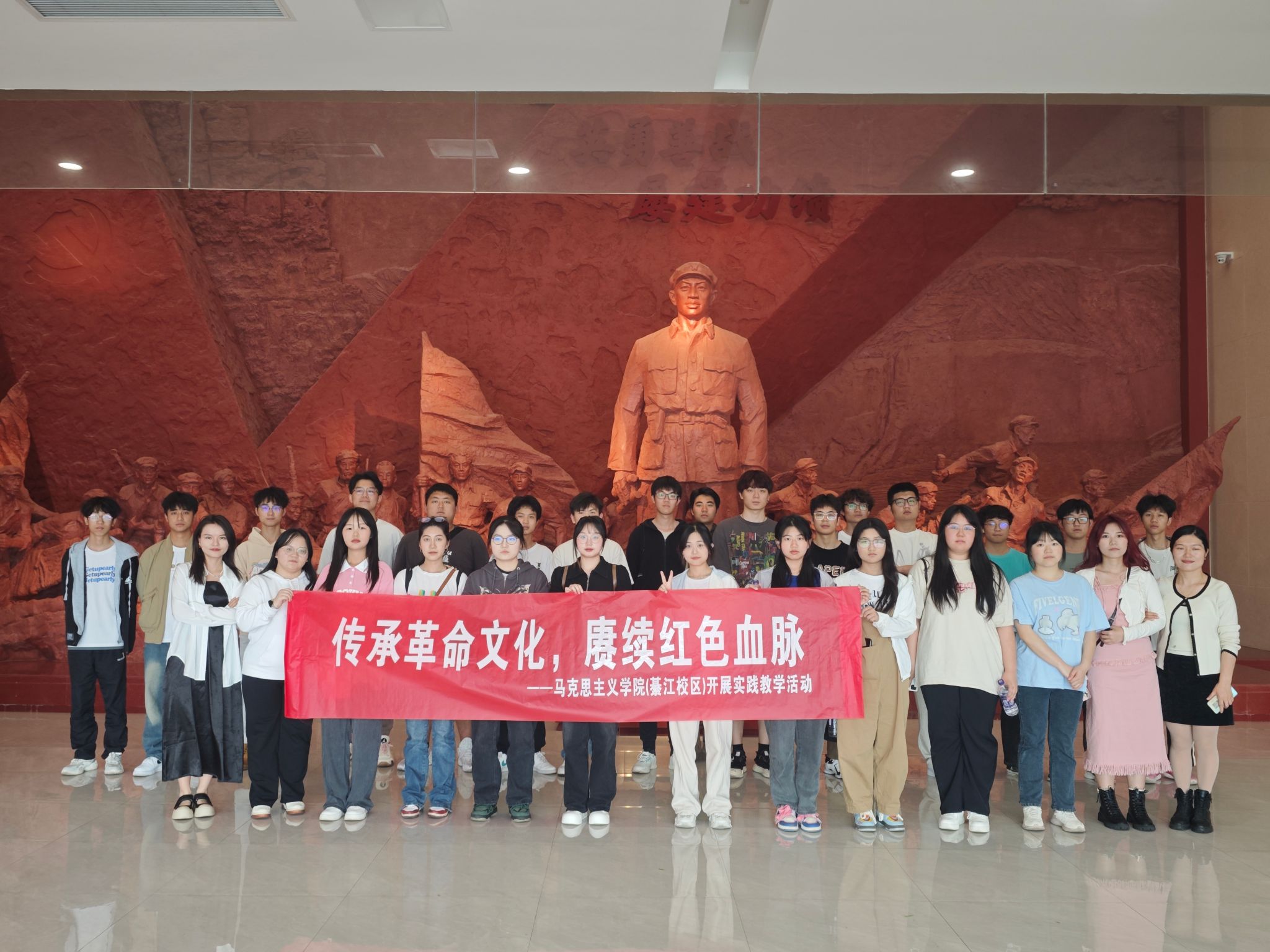 为传承革命文化,赓续红色血脉,深切感悟革命先烈崇高的爱国情怀和革命精神,4月12日下午,马克思主义学院开展了以“传承革命文化、赓续红色血脉”为主题的实践教学活动。本次活动由马克思主义学院杨丽娟、陈沛珊老师带队,来自不同专业的30多名同学共同参与。