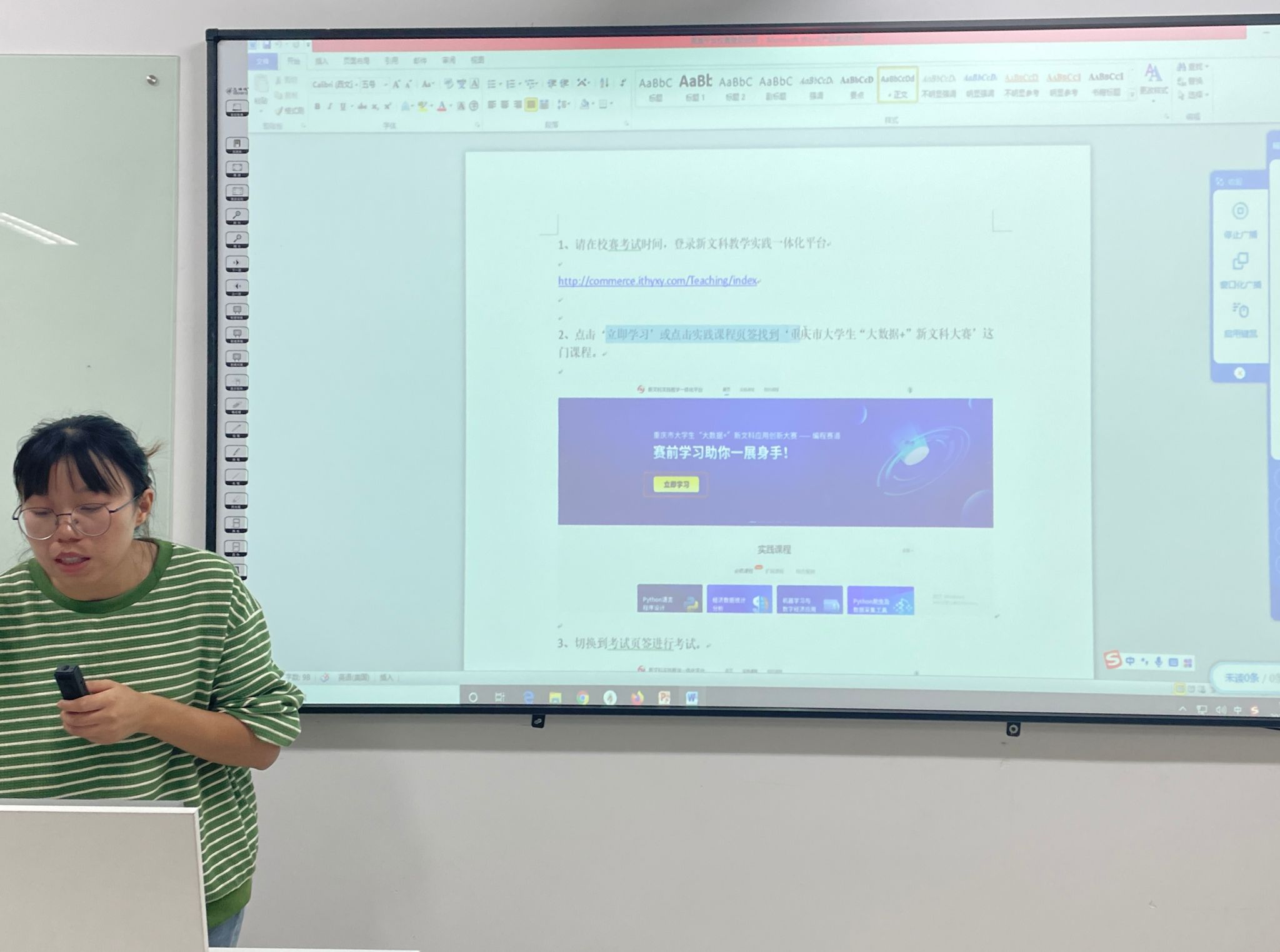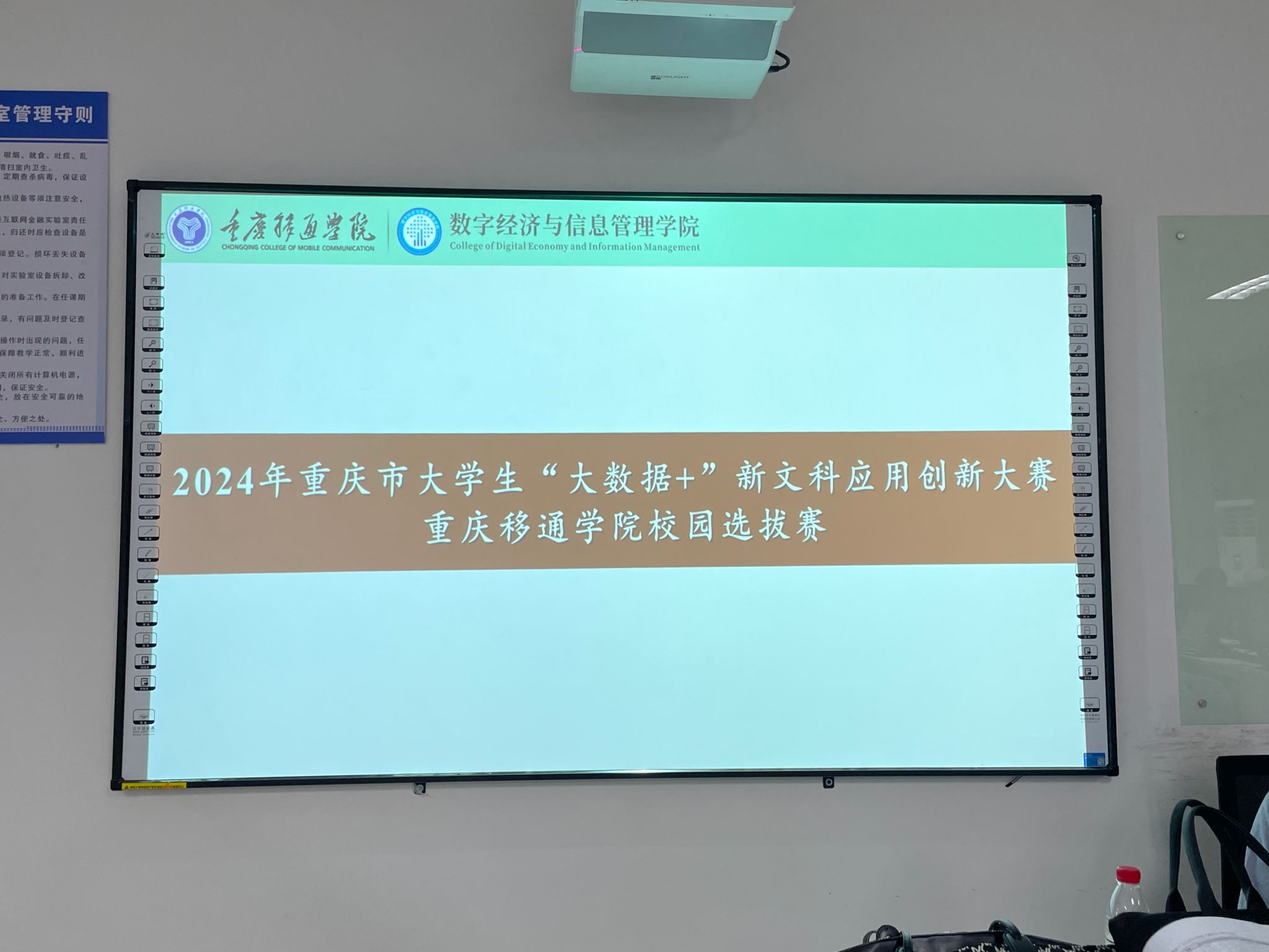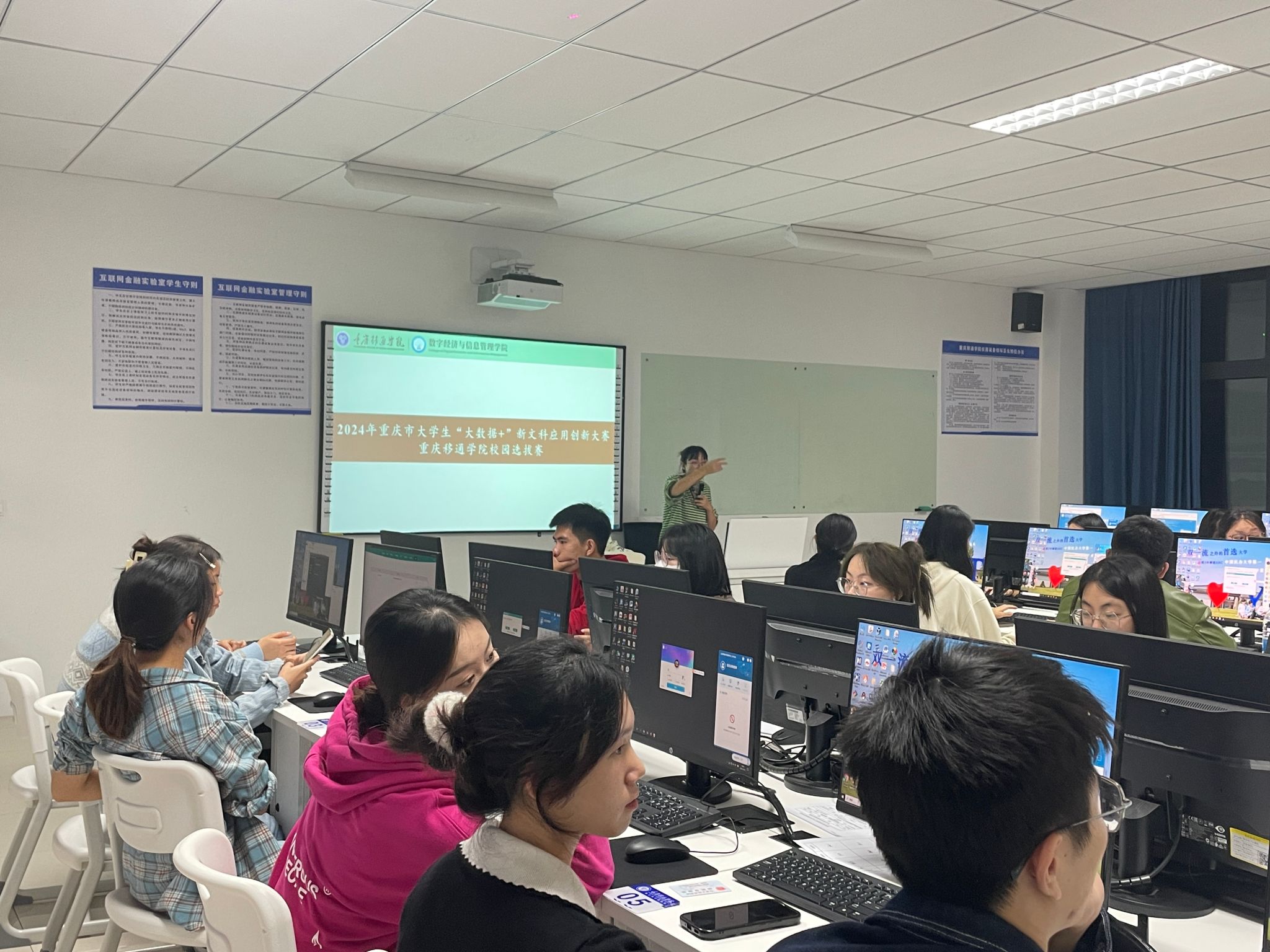 为深入贯彻落实习近平总书记关于运用大数据加快建设数字中国的重要论述,切实提高大同学创新精神和实践能力,培养应用复合创新型人才,给予广大同学一个展示的平台。数字经济与信息管理学院于2024年10月9日19:00-22:00,在贤者楼321,322举办了由重庆市教育委员会主办,数字经济与信息管理学院承办的重庆市大学生“大数据+”新文科应用创新大赛校园选拔赛。出席本次比赛的有数字经济与信息管理学院教学副院长王哲,信息管理教研室主任文豪,信息管理教研室专任教师胡红琼,陈锐,李敏,王红堂,李罗蔓。