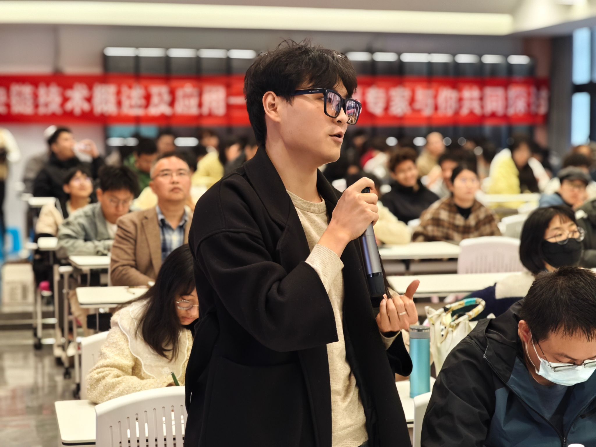 在提问环节,师生踊跃参与,与王教授就区块链技术的专业人才培养、未来发展趋势、实际行业应用挑战及学习路径等问题踊跃提问,王教授耐心解答每个问题,分享了许多实用的学习建议和专业见解,王教授特别强调:“所谓大学就是大量的学,兴趣是学习的最好动力,掌握区块链背后的基础算法和数据结构等,培养持续学习的能力尤为重要。”现场互动热烈,学生们收获良多。信息安全学院通过开展各类学科专业讲座,切实推动了学生对专业知识的吸收和应用能力的提升,也为学校培养适应时代需求的复合型技术人才奠定了基础。