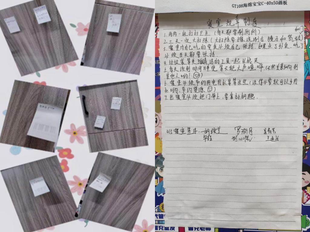 为更有效的让寝室成为大家休息和学习的良好场所,从进入小家第一天开始,成员们就共同签约了寝室公约。经过了一年的相处,大家也通过实际行动印证了寝室公约不单单是一张纸或一份摆设,在寝室长的带领下,大家会自觉整理自己的床位及书桌,也会每周按照抽签方式进行大扫除,这不仅仅是一项任务,更是一份责任,更是交流感情的一个渠道。看着整洁的桌面,干净的地面,整齐的床铺,心中不觉得升起归属感。同时,大家会匿名提出寝室成员的优缺点,为的是让大家继续保持长处,及时补齐短板,促使寝室关系更加和谐,共同进步。一个敢于接受自己的缺点并及时改正的青年,将会带给我们一个更好的自己
