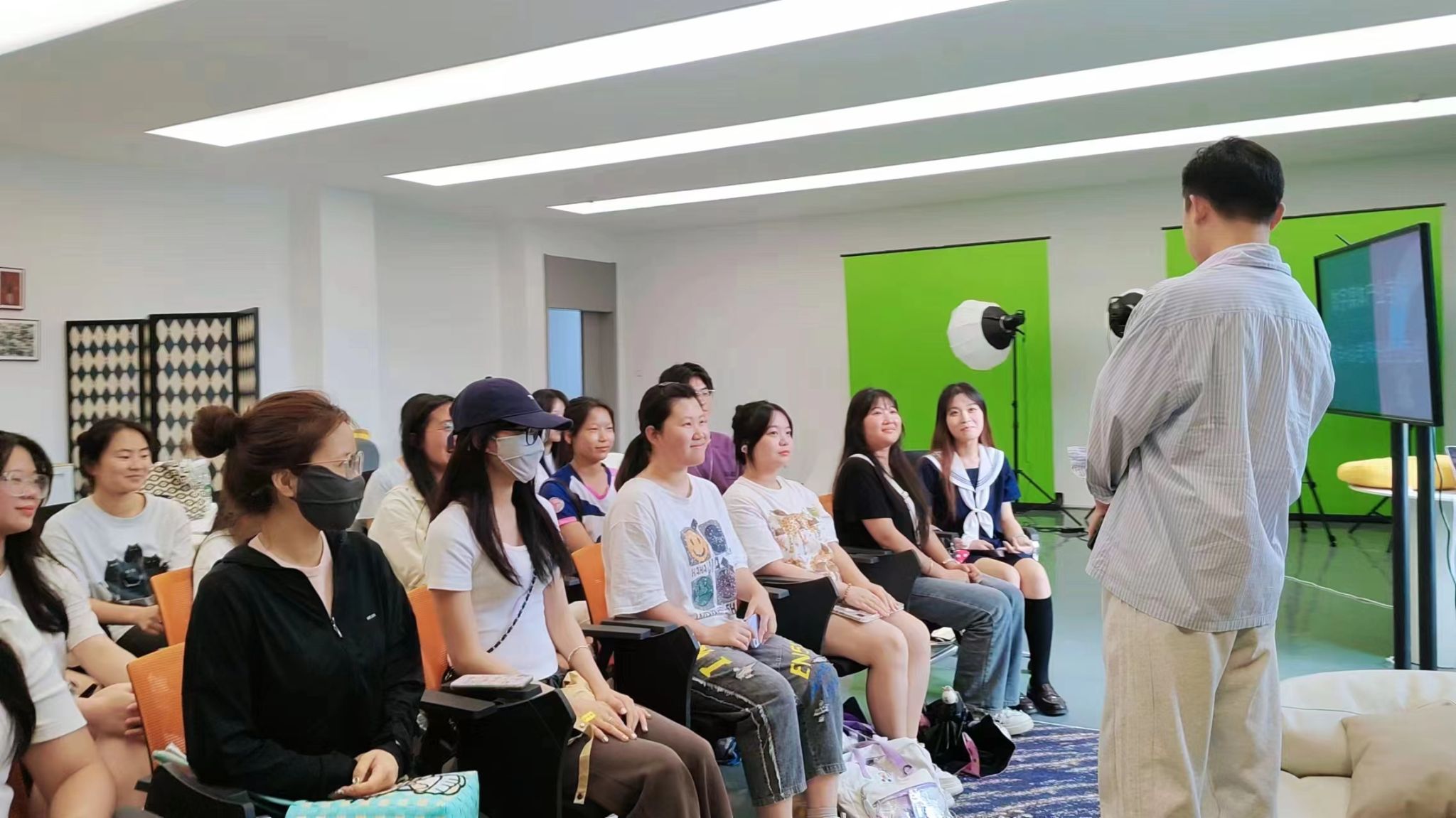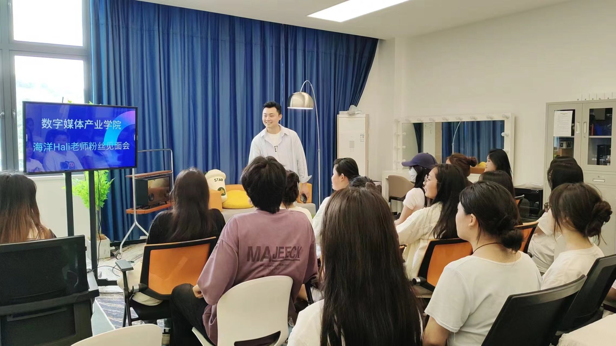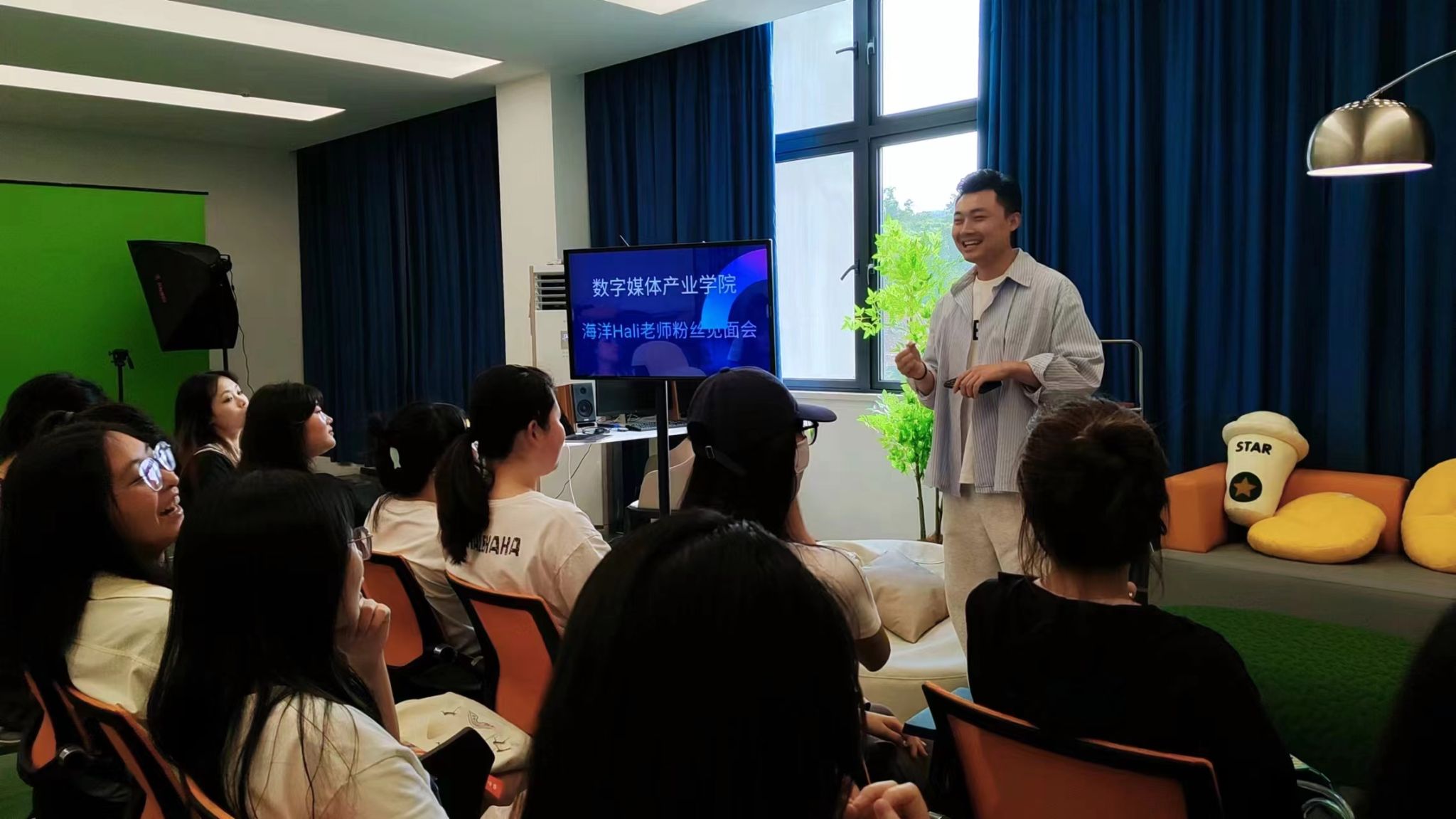 除了精彩的互动环节,本次粉丝见面会还融入了短视频拍摄和运营的元素。活动现场设置了专业的拍摄设备,为同学们提供了与何老师亲密互动的机会。
