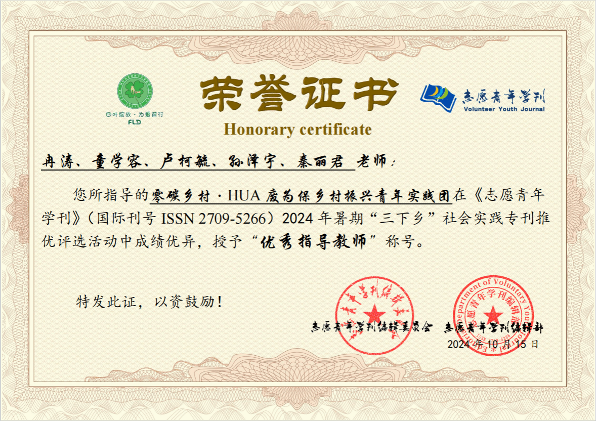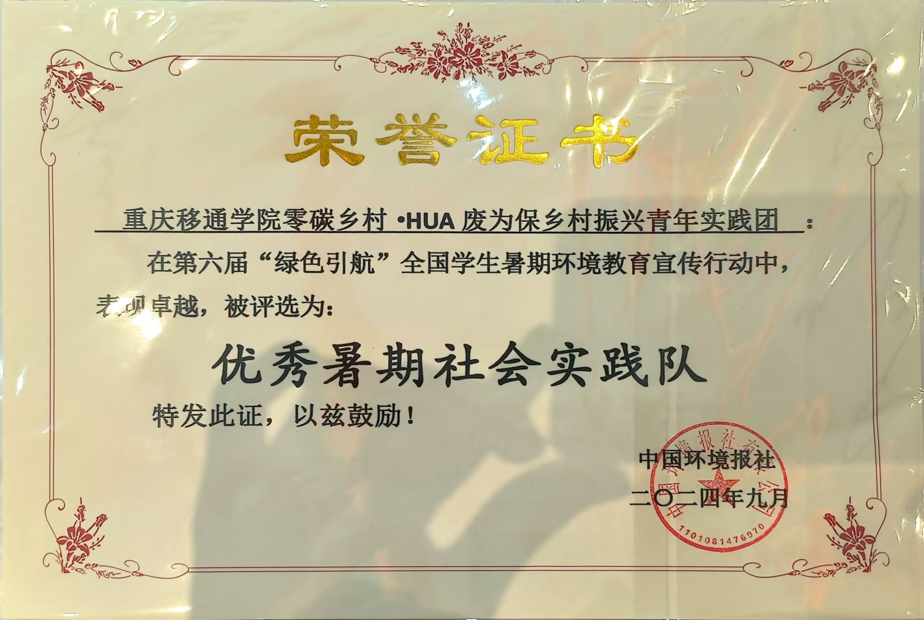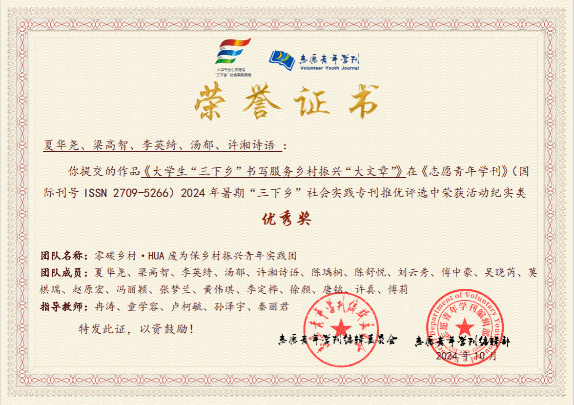 在2024暑期暑“三下乡”社会实践活动中,零碳乡村·HUA废为保乡村振兴青年实践团持续发力,团队作品《大学生“三下乡”书写服务乡村振兴“大文章”》成功录入《志愿青年专刊》2024年暑期“三下乡”社会实践专刊(上辑-活动纪实),并在推优评选中荣获优秀奖。我校“三下乡”社会实践活动指导老师冉涛、童学容等5名教师被授予“优秀指导教师”称号;夏华尧、梁高智、李英绮等17名零碳乡村·HUA废为保乡村振兴青年实践团在2024年暑期“三下乡”社会实践专刊推优评选中荣获活动纪实类优秀奖。