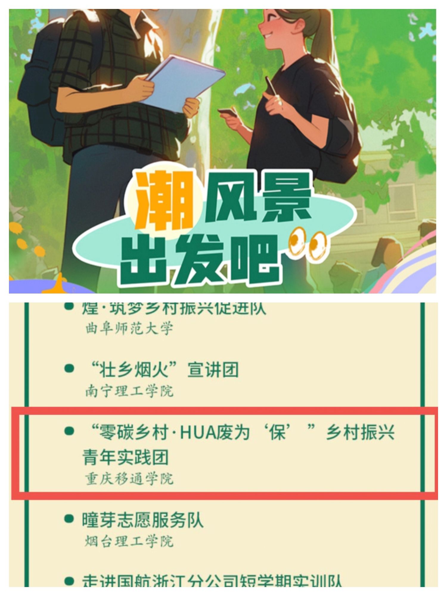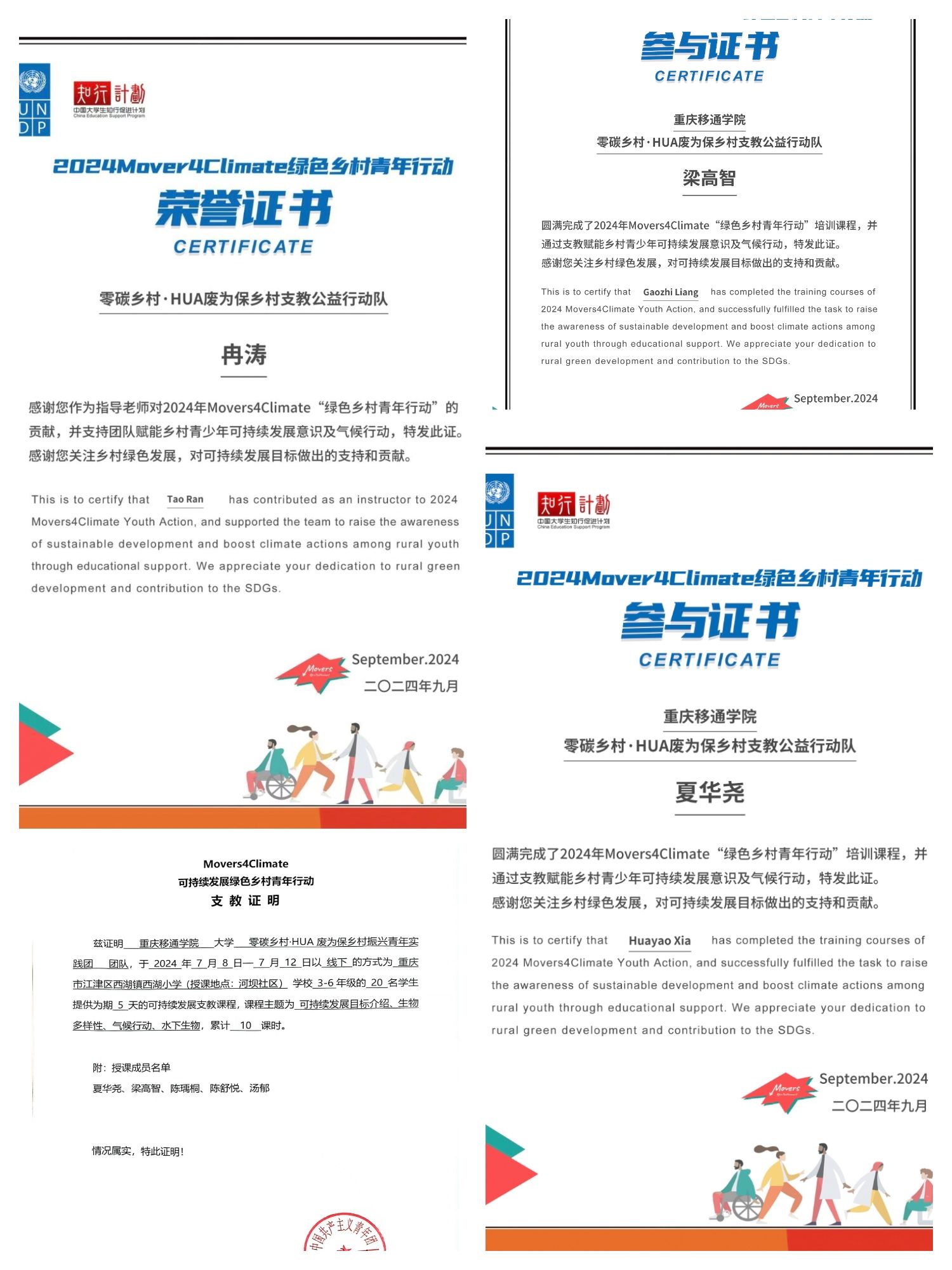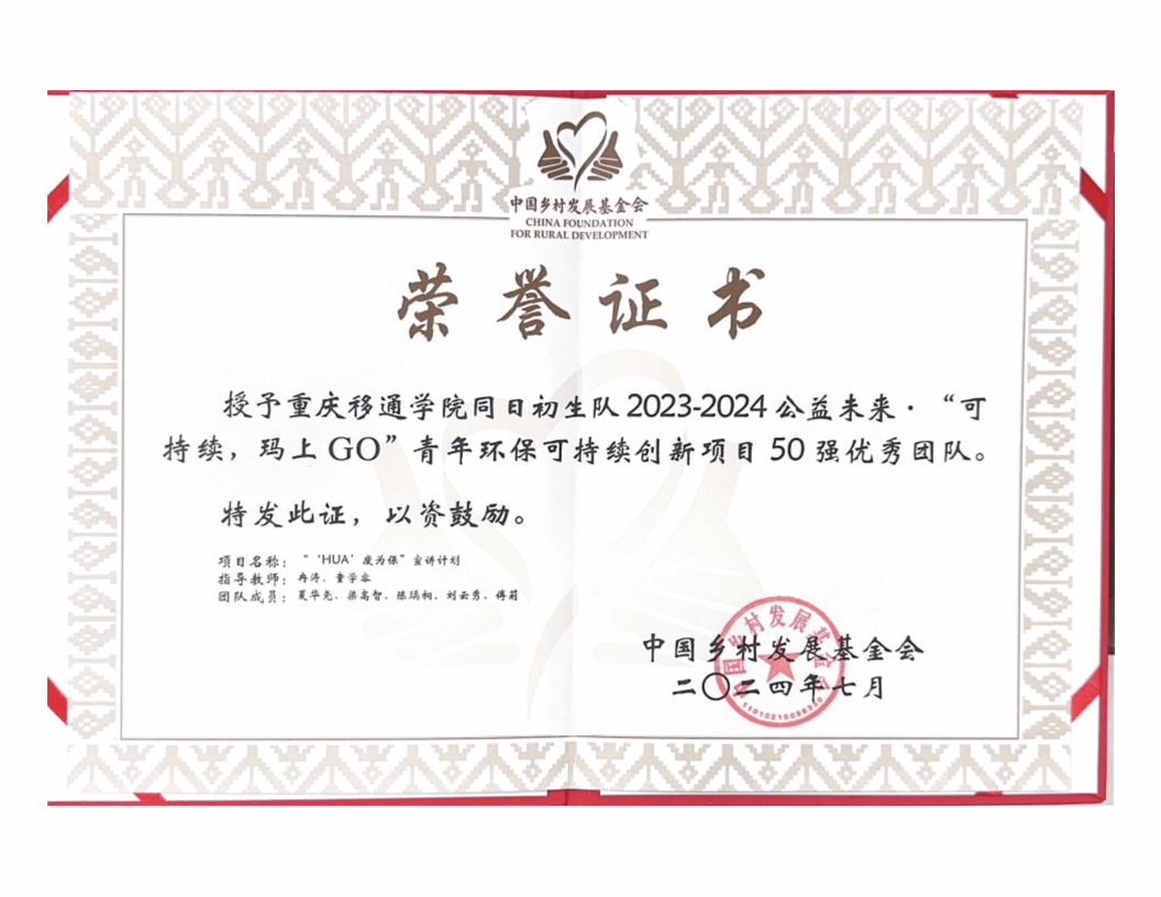 在2024暑期暑“三下乡”社会实践活动中,零碳乡村·HUA废为保乡村振兴青年实践团持续发力,团队作品《大学生“三下乡”书写服务乡村振兴“大文章”》成功录入《志愿青年专刊》2024年暑期“三下乡”社会实践专刊(上辑-活动纪实),并在推优评选中荣获优秀奖。我校“三下乡”社会实践活动指导老师冉涛、童学容等5名教师被授予“优秀指导教师”称号;夏华尧、梁高智、李英绮等17名零碳乡村·HUA废为保乡村振兴青年实践团在2024年暑期“三下乡”社会实践专刊推优评选中荣获活动纪实类优秀奖。