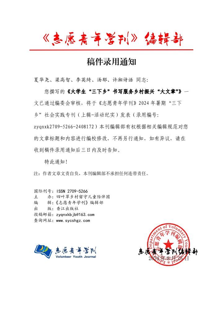 为深入学习贯彻习近平新时代中国特色社会主义思想和党的二十大精神,贯彻落实习近平总书记关于青年工作的重要思想,引导和帮助广大青年学子在与现实相结合的“社会大课堂”中“受教育、长才干、作贡献”。2024年10月,由志愿青年学刊编辑部开展的2024年暑期“三下乡”社会实践专刊稿件征集评选结果揭晓,我校共斩获集体和个人共23项荣誉!