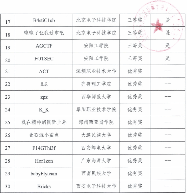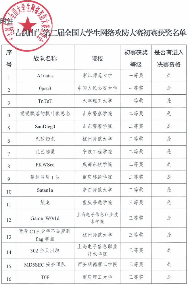 在本次初赛中,选手们通过多个攻防技术模块的挑战展开智慧交锋,各参赛团队全力以赴,呈现出精彩绝伦的技术盛宴。经过层层激烈角逐,大赛组委会严格评选,最终决出全国30强名单,其中一等奖3支队伍,二等奖7支队伍,三等奖10支队伍,优秀奖10支队伍,排名前20的队伍将成功晋级决赛(同一单位最多入选2支队伍),若有决赛弃赛的队伍,则由获得优秀奖队伍依次序替补。现将各队伍获奖等级情况公布如下(具体公示文件请查看附件)。