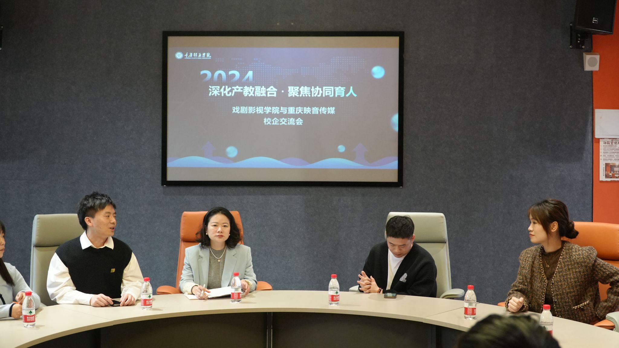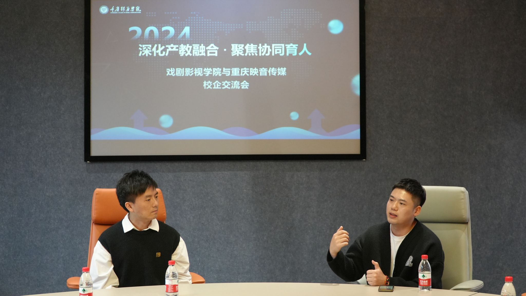 吴蔚萌总监介绍了重庆映音传媒的基本情况,其中包括公司发展理念、与我院深度合作发展的方式方法等,并表示将积极履行企业社会责任,充分挖掘企业优势资源,大力支持学校学科专业发展,进一步拓宽、深化合作内容。影视工程教研室主任秦琦琅介绍了学院情况及教学特色,他强调戏剧影视学院会持续加大差异化创新力度,突破校企单一项目合作的现有模式,构建以校企联合创新中心为支点的教学团队创新模式,与企业共同开展横向项目,推动科研成果转化,不断增强合作共进能力。影视工程教研室郭嘉琦老师提出希望可以结合企业开展连续性的课程,以便更好地入驻到书院。吴总监对此表示会以同学们的兴趣为导向,将专业知识与实际工作相结合,提供从前期策划到运营的培训全流程,校企合作深度挂钩,能够较好的契合二者之间的需求。
