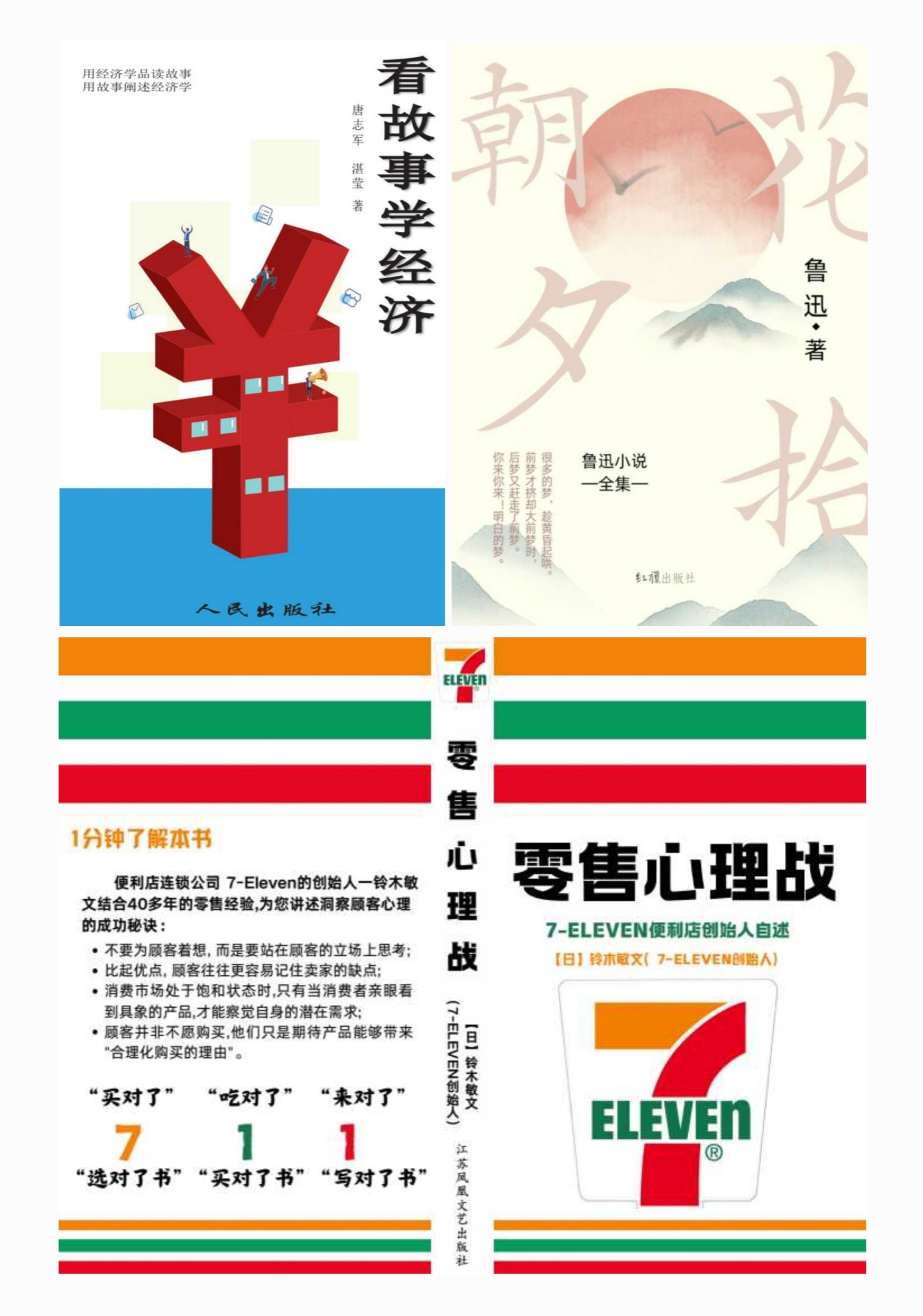 黄莉萍同学制作的《春天,我想去田野里采一朵花》书籍封面,使用白云,蓝天,草地,花朵等元素,她表示:“希望能够让读者第一时间感受到书籍的独特魅力,引导读者走进一个充满自然与内心美好的世界,找到在繁忙的社会生活中的心灵净土。”罗宗君同学设计的《朝花夕拾》书籍封面,通过底色来营造出温馨,怀旧的感觉,与书中表现的情感相得益彰。她解释:“我在封面中加入的红色圆形元素,象征着夕阳,同时也暗示了鲁迅作品中,所表达的人性的解放和自由精神的追求。”在刘成林同学制作的《拿故事学经济》书籍封面中,以一个大型的红色人名币符号,明确书籍主题,并在周围增加一部分生活素材,她认为:“通过直观的经济符号和生活场景的结合来理解和学习经济学原理以及概念,更加生动,易于理解。”张洪彬同学所设计的书籍封面是《零售心理战》,以711便利店的logo为中心,引人注目。他分享到:“这本书不光在创业时能够帮助我们,还以心理学原理来帮助我们研究顾客的想法。”