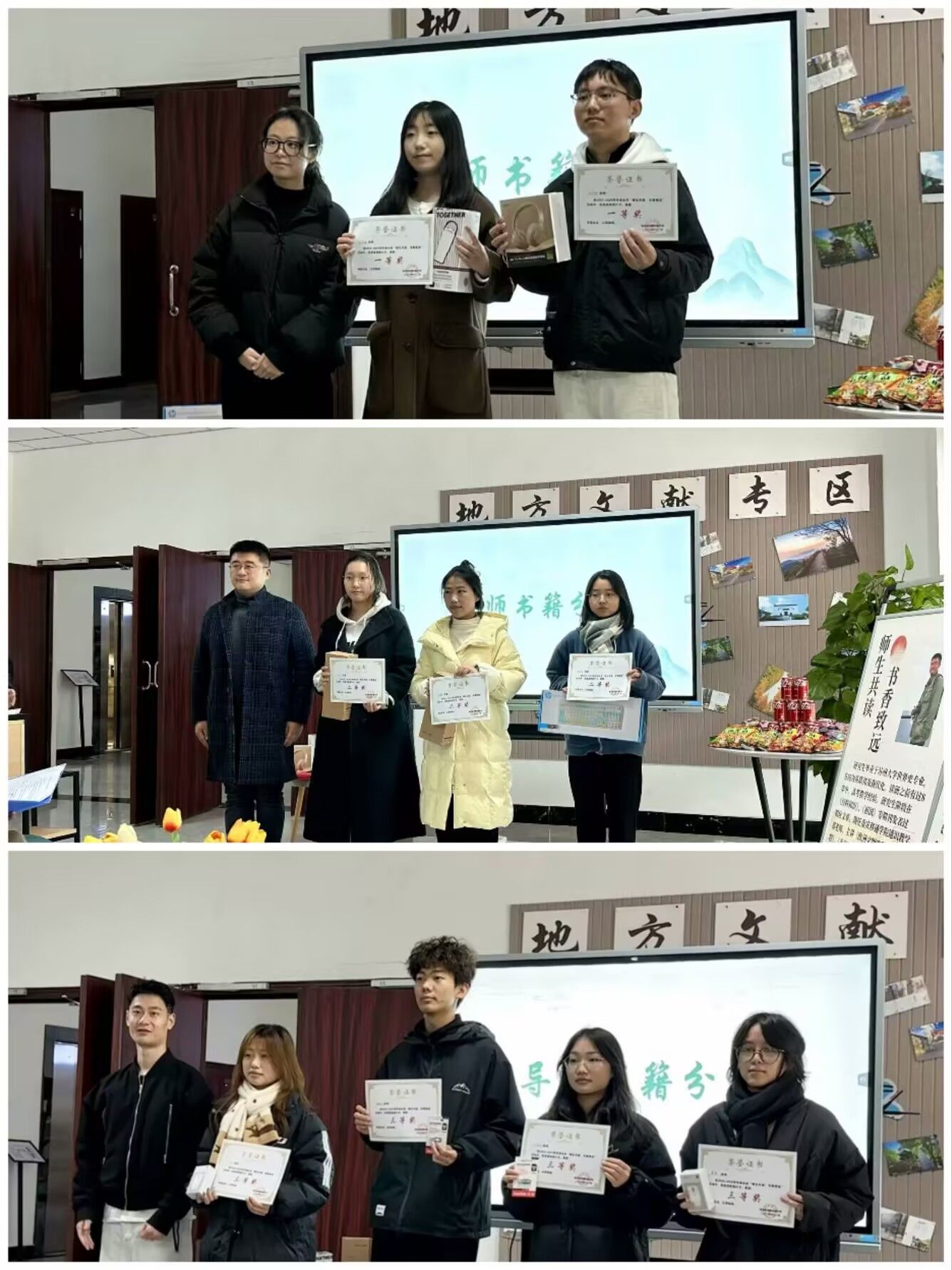 俄国作家赫尔曼・黑塞曾提到:“世界上任何书籍都不能带给你好运,但是它们能让你悄悄成为你自己。”在这一个月的打卡活动中同学们已经深刻地领悟到了这句话的内涵。根据到馆次数、借阅书籍数量及阅读心得(书籍封面设计)进行综合评比,评选出在读书活动中表现优异的同学。杜望老师,毛致远老师,易宋佳珈老师为获奖同学颁发属于他们的荣誉证书与奖品。这是对获奖同学热爱阅读、勤奋钻研的高度肯定,同时还激励着更多同学在阅读的道路上奋勇前行,在书籍的滋养下,不断探索自我,成就更美好的自己。最后张正光老师进行总结发言;“我们图管会会更加努力为大家营造一个更好的读书环境,欢迎更多的同学来参与我们的读书分享会,希望大家保持对阅读的热情,在阅读中收获知识。”
