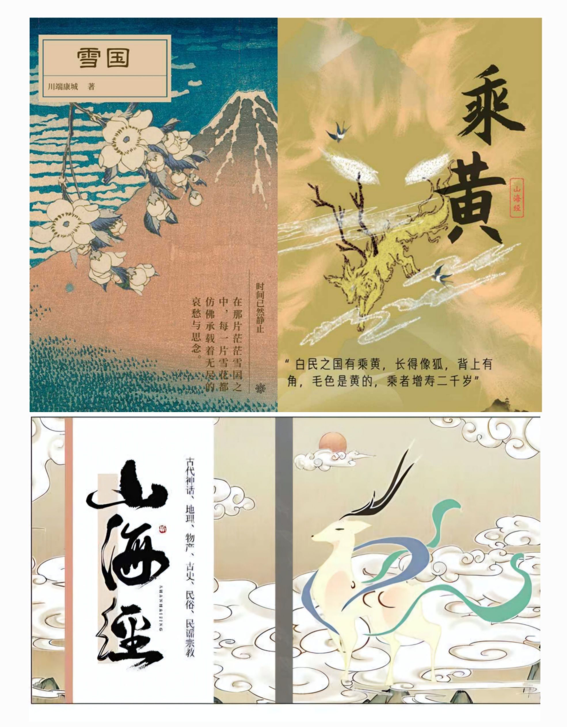 书页轻轻翻动,我仿佛能听到历史的回声,感受到作者的情感,书页间的世界是如此广阔。图书封面是读者与书籍之间的第一印象,它不仅承载着吸引眼球的重任,更是书籍内容和精神的直观体现。刘梦玲同学和唐霜同学都同时选择了《山海经》进行制作,但二人风格却迥然不同。唐霜同学选择九色鹿,农作的图案,表达出古代当时的地理风貌以及古人对丰收和富饶的愿望。刘梦玲同学选择以乘黄为元素,乘黄是吉祥和长寿的象征,只有心地纯洁之人才能见到它们的真身。她同时也设计了《雪国》的书籍封面,让大家感受到一种神秘,遥远,纯净的氛围。