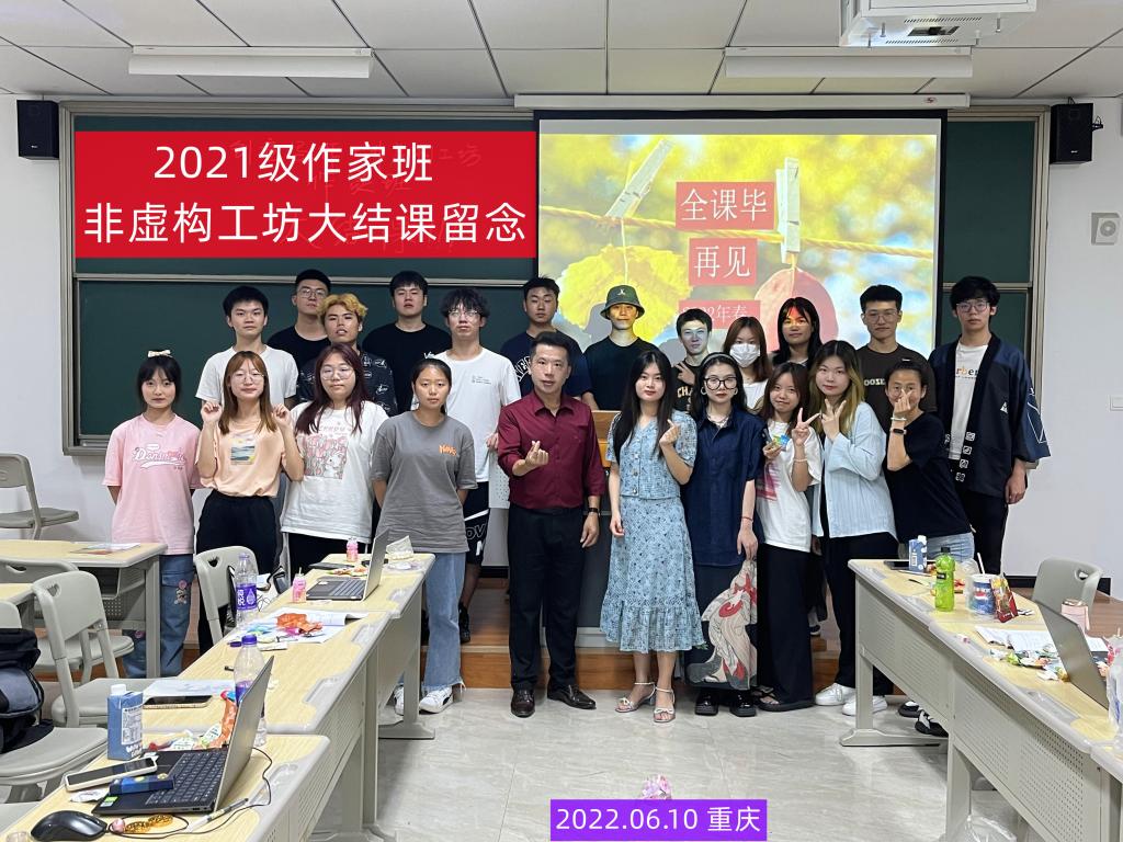 2021级作家班的课全部结束了,非虚构工坊导师王恒绩情难自禁,告别感言的声音都颤抖着。班长李博文小声说:王老师动情了。美女老师李慧文在今天的告别课上,甜美地笑着说:你们是綦江校区开天辟地的第一届作家班学生,也让我这个新老师得到了快速成长。不管今后的路有多坎坷或多顺畅,请记住2021至2022学年,你们在作家班非虚构工坊的岁月,有两位老师,真心爱过你们。再见了!