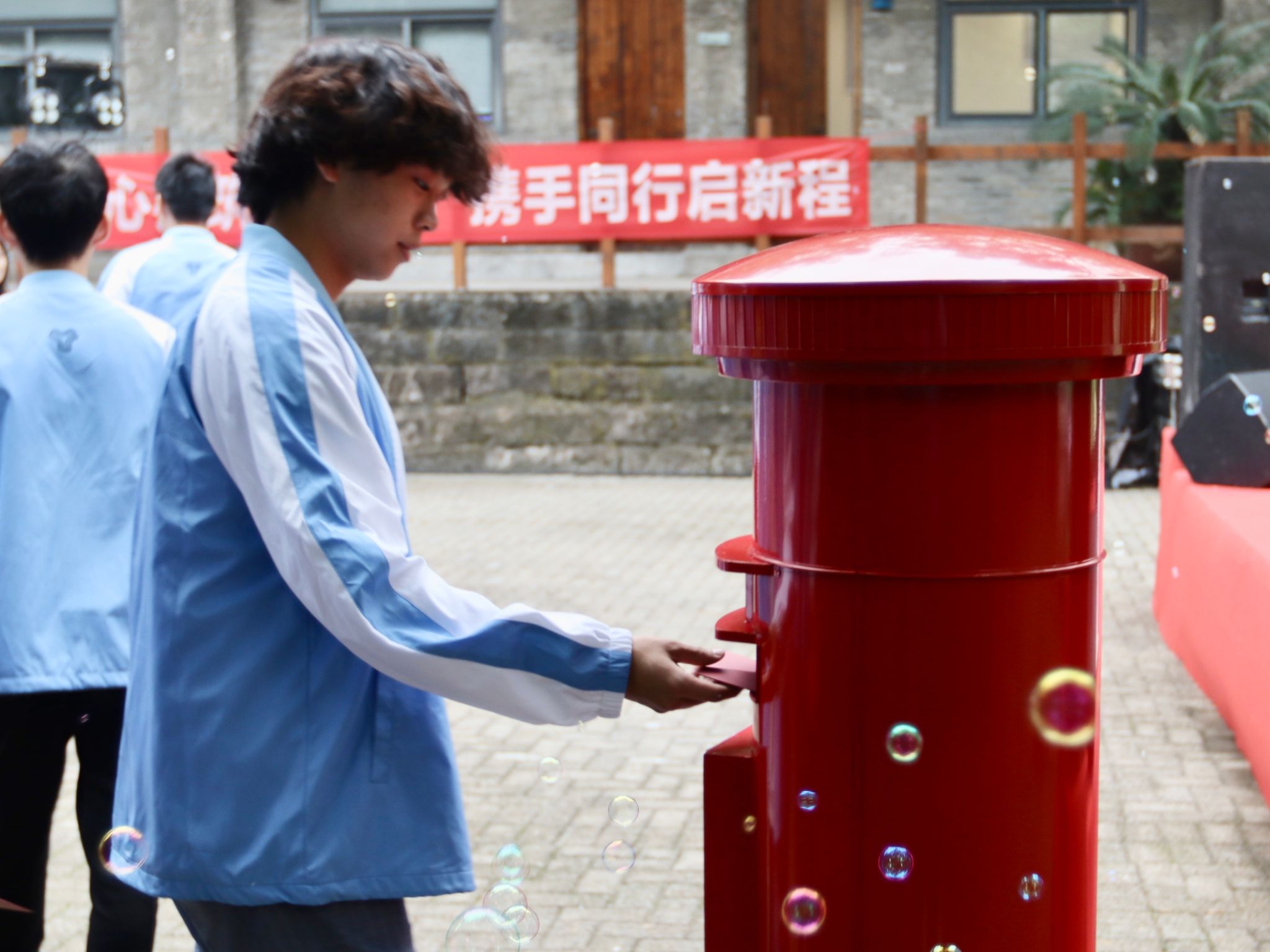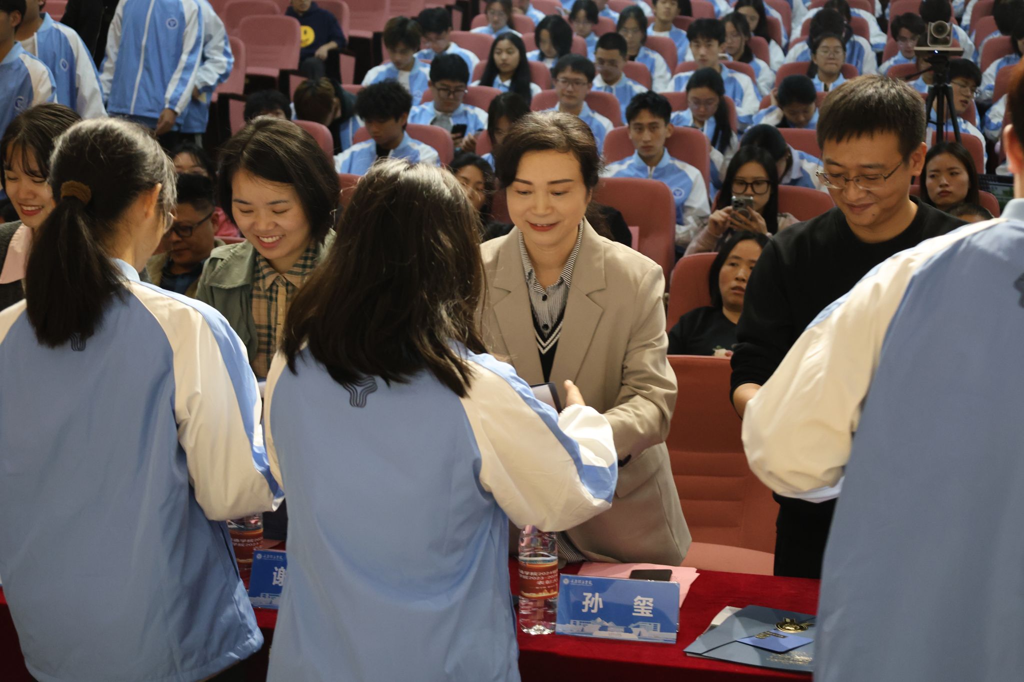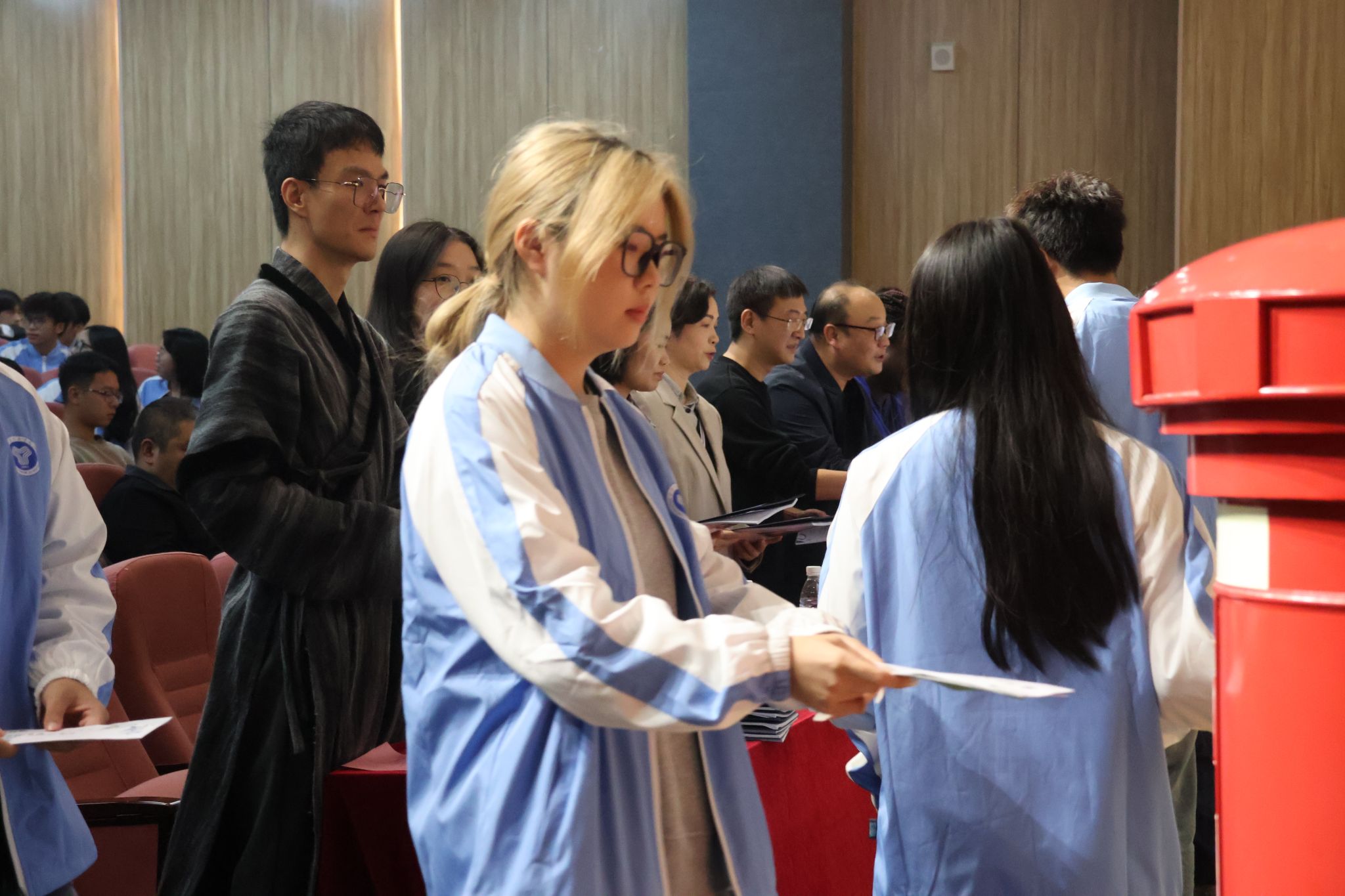 随后,李军副院长介绍了由学校“吾生涯苑”辅导员工作室为大家精心设计的升级版《学生成长档案》,希望同学们能够认真记录大学的学习与生活点滴,以及导师与辅导员的成长反馈。在“时光邮筒,成长密码”环节,新生们将“给未来自己的一封信”投入邮箱,由学院妥善保管,象征着大家对未来的期许与承诺。校领导、学院领导和老师代表为2024级远景学子颁发入学纪念卡、院徽和学生成长档案,24级学生全体起立佩戴院徽,这一刻,大家以远景学子的身份肩负起远景的荣耀,带着责任与自信,心无旁骛征途踏,步步为营绘锦图。