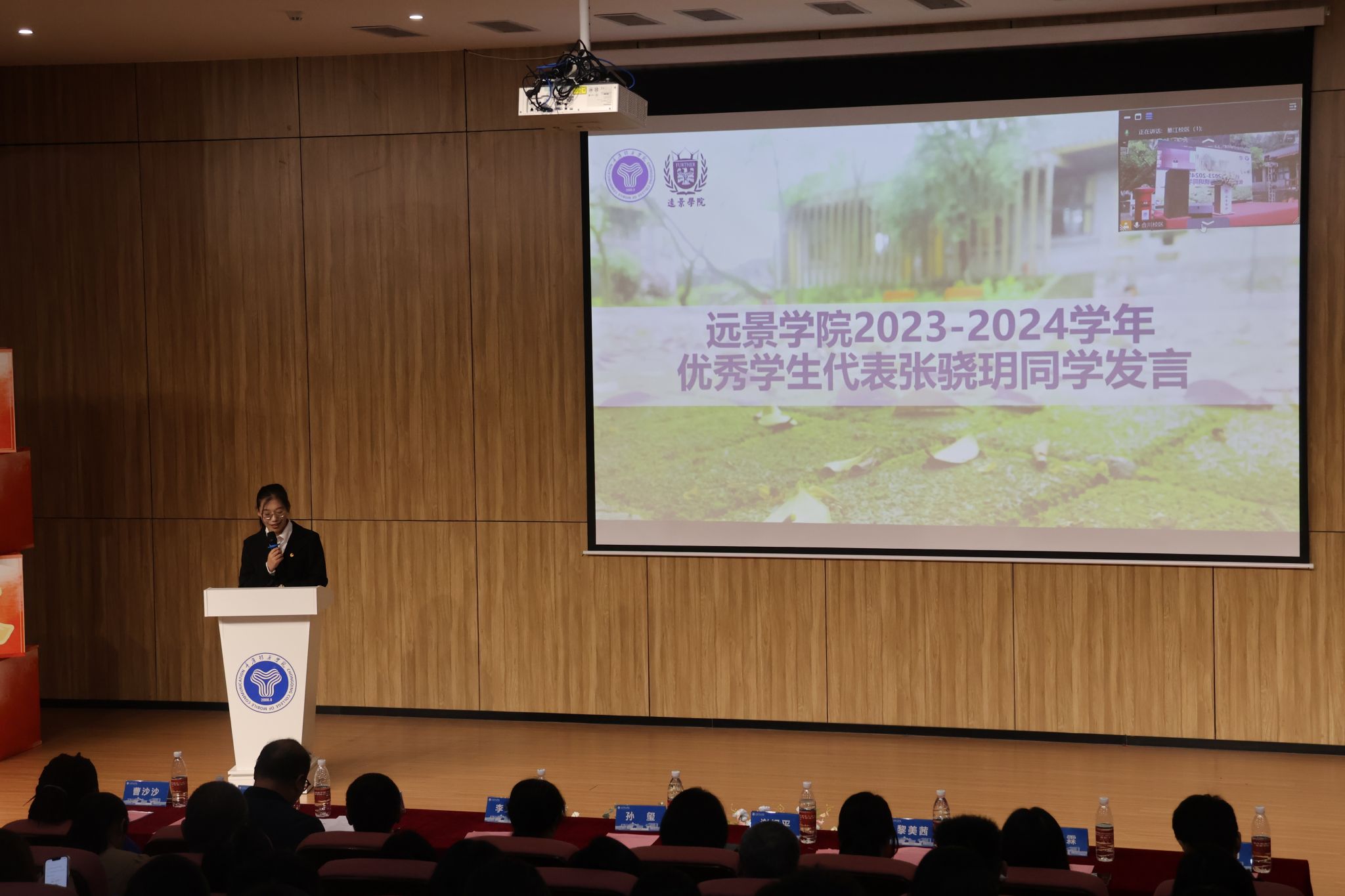 俊才登台语若珮,妙论连珠映璧晖。2024级英语专业杨妮睿同学作为荣誉生代表发言,她用流利的中英文与大家描述了与远景学院这场美丽的邂逅,从被远景学院独特的双导师体系、通识教育和小班教学所吸引,到加入远景学院后切身体会并逐渐爱上这种截然不同的教学模式。同时,她向我们分享自己对远景学院的个人理解和体验,提议同学们应响应远景教学理念,成为具有批判性思维,远大抱负的实干者,全力以赴,以青春的活力,书写辉煌篇章。