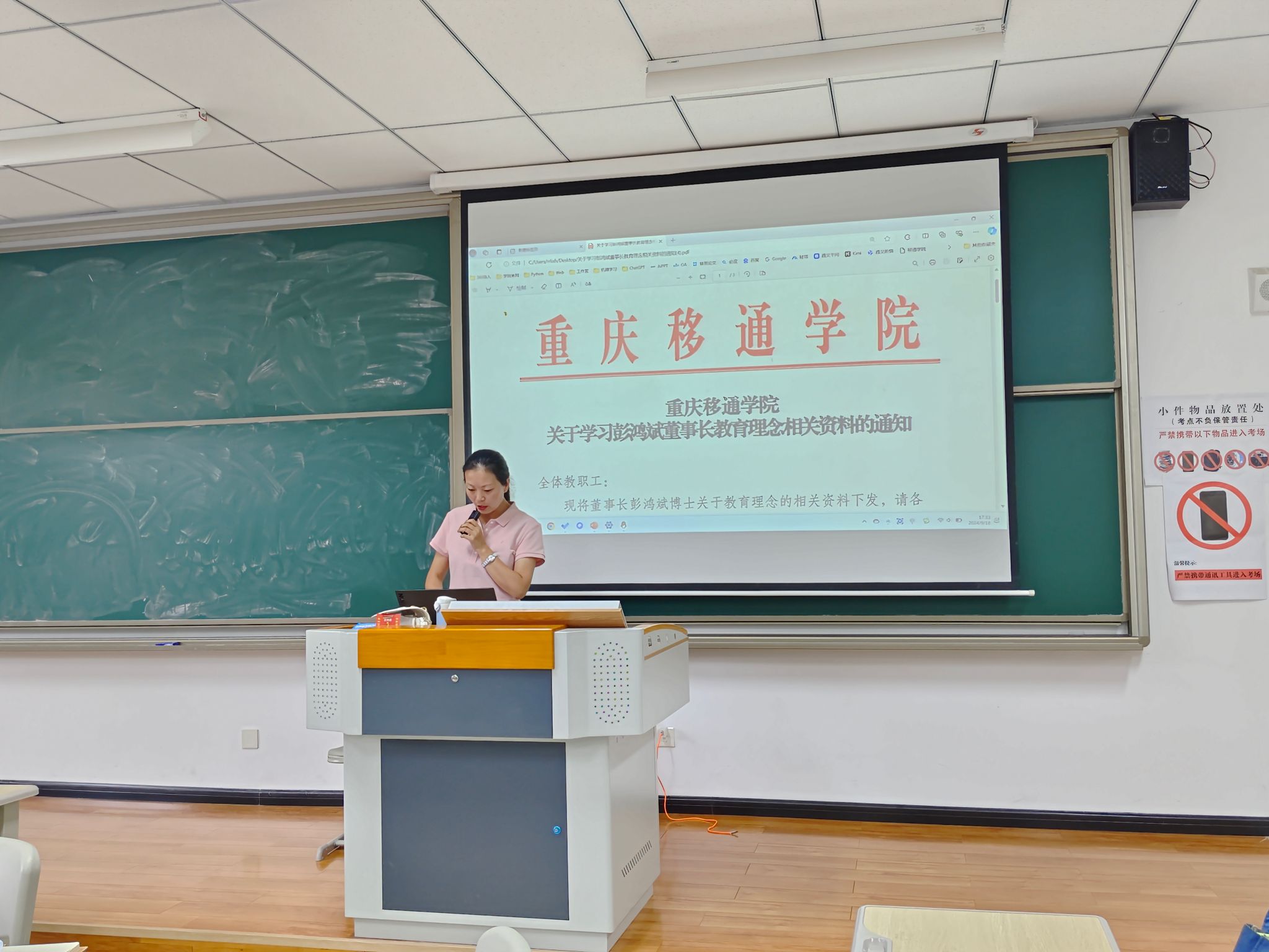 为进一步提高教育规范性,教育创新性,教育协调性,促进学院交流协作,担当社会教育责任,建设高质量特色教育。9月18日17:00,数字经济与信息管理学院在仁者楼413教室开展了董事长讲话教育理念集中学习会。会议由数字经济与信息管理学院院长刘贵容主持,数信学院綦江校区全体教师参会。