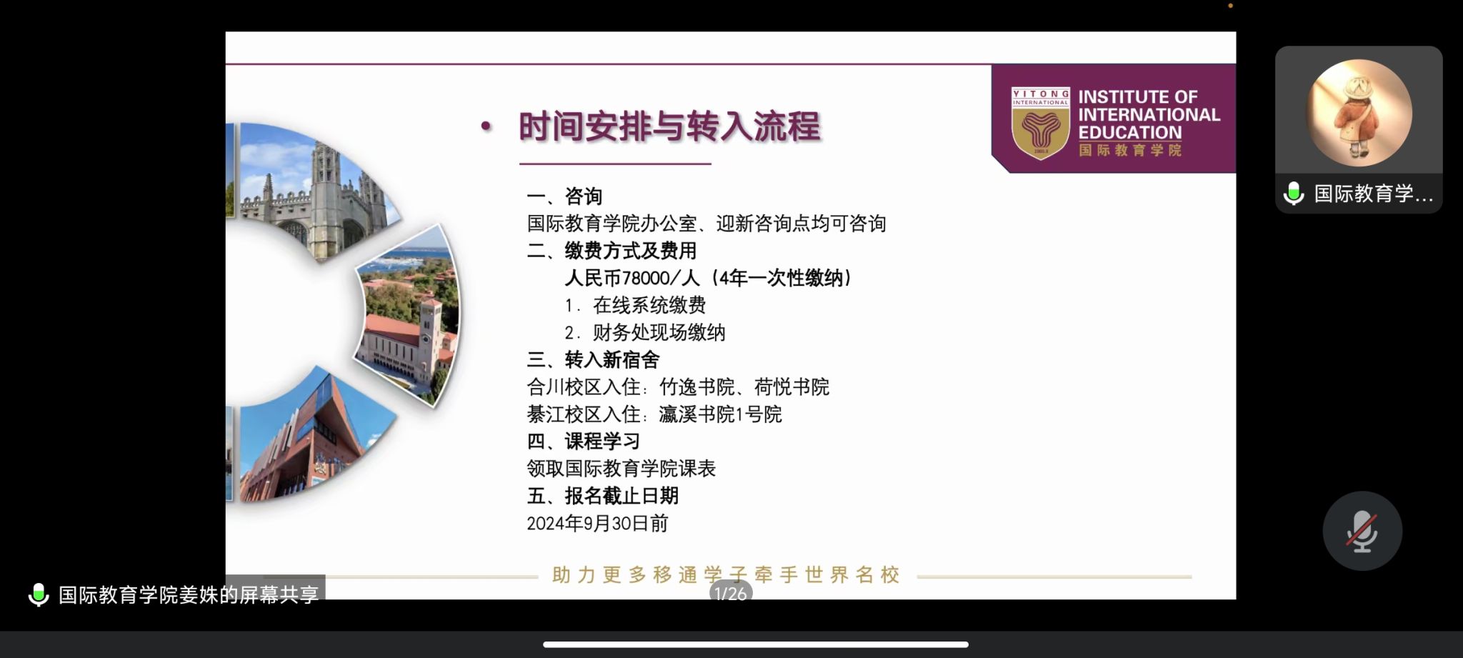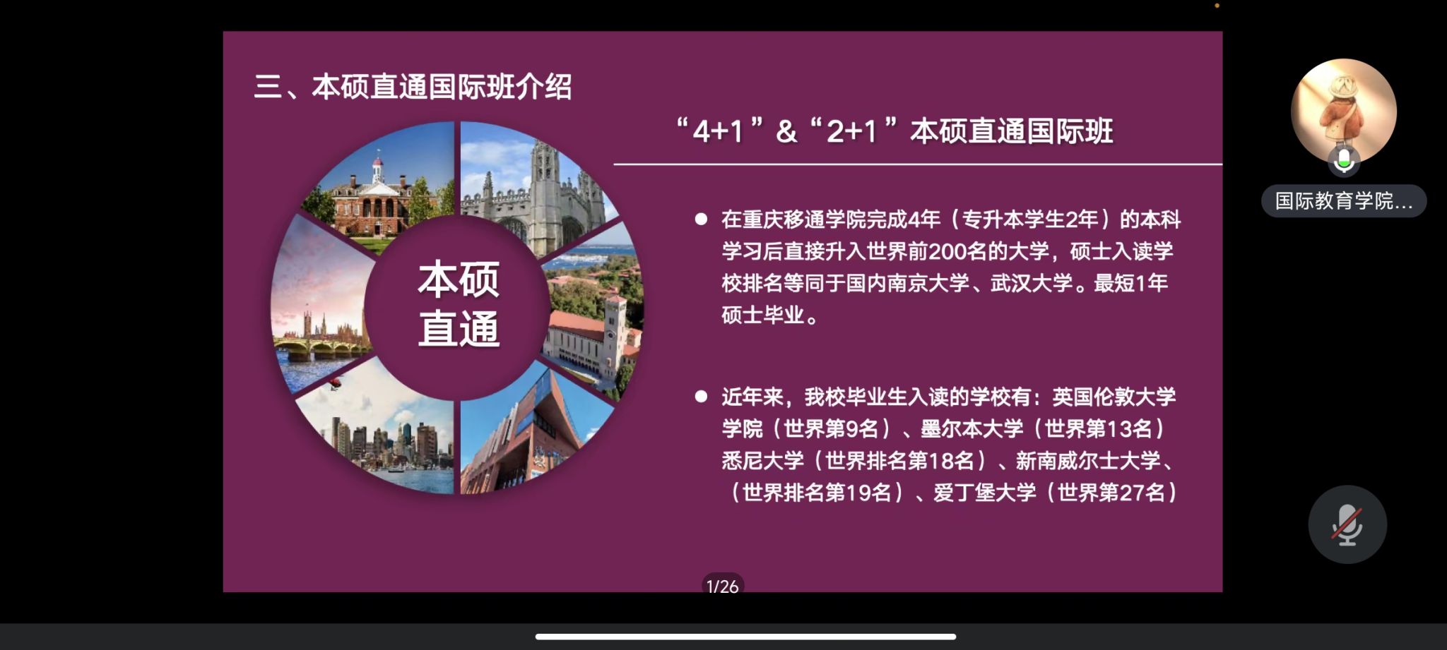 紧接着,姜院长为在座的各位老师介绍了“4+1”&“2+1”本硕直通国际教育班项目,综合本项目的用时短、效率高、成果显著等特点,选择本项目意味着在重庆移通学院完成4年的本科生毕业后可以直接升入世界前200名的大学,硕士入读学校排名等同于南京大学、武汉大学,有效帮助学生缓解升学压力,除此之外,姜姝老师介绍了涉及本项目的多个国际院校:英国伦敦大学学院、墨尔本大学、悉尼大学、新南威尔士大学、爱丁堡大学,学生可以通过本项目走进世界名校,实现升学梦想。