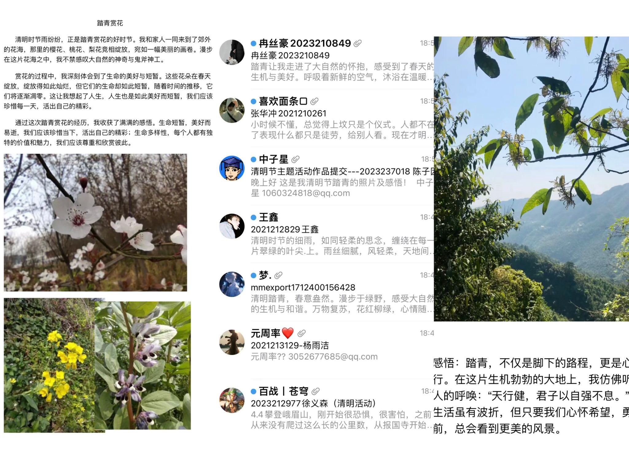 本次活动以线上提交作品的形式开展,同学们都积极地参与进来,上传踏青或祭祖的照片并附上自己的心得感悟。通过本次活动,同学们能够深切地感受到独属于清明节的那份节日氛围,同时也更好地了解到有关清明节的传统文化。同学们也通过清明假期时间亲身投入自然,踏青赏景,感受春意。