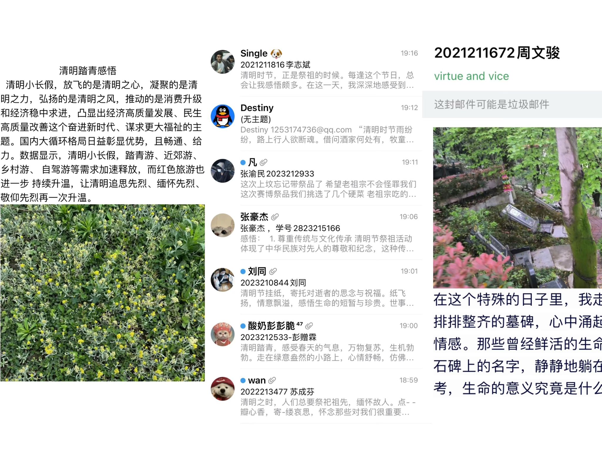 日暖风熏,翠柏凝春,又是一年春草绿,又到一年清明时。清明是仲春与暮春的交汇点,是春天临近尾声的一个节气,更是兼具自然和人文气息的传统节日。在这个亦节亦气的日子,数字经济与信息管理学院于4月3日至4月7日举办了“清明时节雨纷纷,踏青遥祭寄哀思”清明节线上主题活动,共计1200余名同学参与其中。此次活动为同学们搭建了一个清明节日常的分享平台,鼓励同学们多角度多方式去体会清明节的节日氛围,去享受春天、感受自然,但同时也强调不忘追忆先人、缅怀先辈,要传承民族传统,弘扬民族文化。