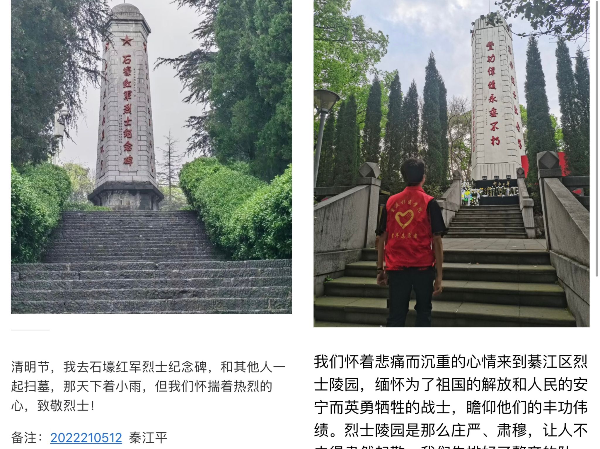 此次清明节线上主题活动,参与者们在活动时间内分别提交了自己进行清明节有关活动的日常照片并附上了一份心得感悟。大家的清明节活动内容丰富多彩,有踏青出游,有祭祖扫墓;感悟的字里行间也是真情实感的流露。精心挑选的照片是活动的印记和见证,真心诚意的感悟是参与活动的心得和体会,即使是定格不动的照片,再次回看时依旧会心头一震,因为是在有意义的日子里做的有收获的事情。