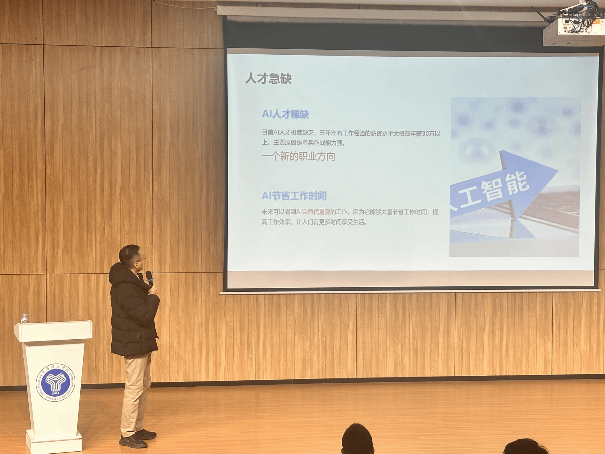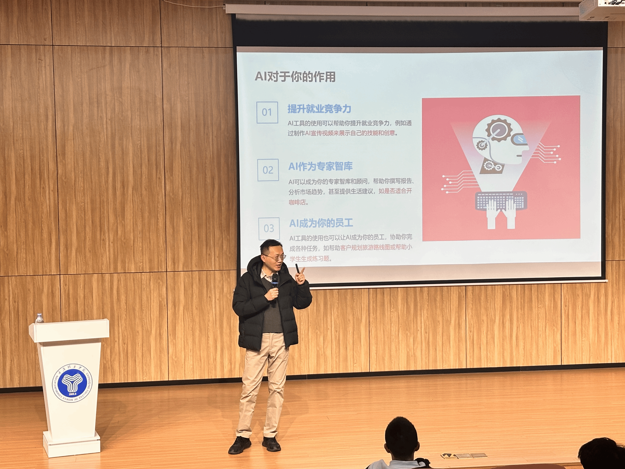 活动伊始,深圳市天择科技有限公司重庆分公司负责人张铭以深入浅出的方式,精辟地论述了AI工具在当今时代所占据的举足轻重的地位。他着重指出,熟练掌握AI工具已成为当前不可或缺的核心职业技能。在就业领域,AI工具能够大幅度提升学生的职场竞争力。学生可以利用AI技术制作宣传视频,以更加鲜活、直观的方式展现自己的技能与创意,从而在求职大军中崭露头角。此外,张铭老师还详尽地介绍了AI的诸多实用功能。AI不仅能够作为专家的智库,辅助学生撰写报告、分析市场趋势,还能够在日常生活中为人们提供决策支持。同时,AI还能够如同“得力助手”一般,协助人们完成各类任务,无论是为客户规划旅游路线,还是为小学生生成练习题,AI都能够高效且精准地完成。