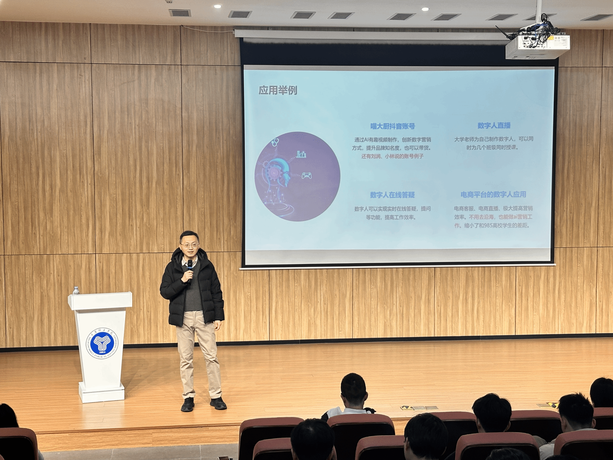 在应用举例环节,张铭老师列举了丰富的案例。以喵大厨抖音账号为例,其借助AI制作有趣视频,创新数字营销方式,不仅提升了品牌知名度,还实现了带货盈利。在教育领域,大学老师利用数字人可以同时为多个班级授课;电商行业中,数字人在客服和直播方面的应用,极大地提高了营销效率。这些案例让学生们直观感受到AI在不同行业的广泛应用和巨大潜力。