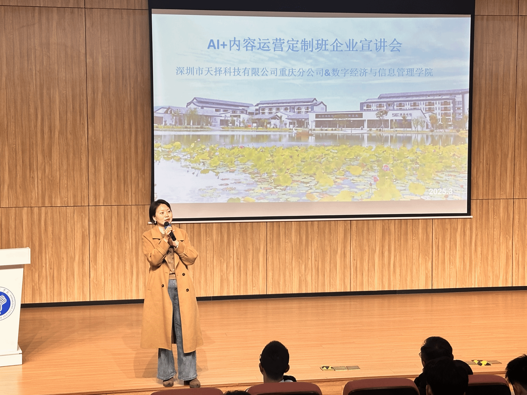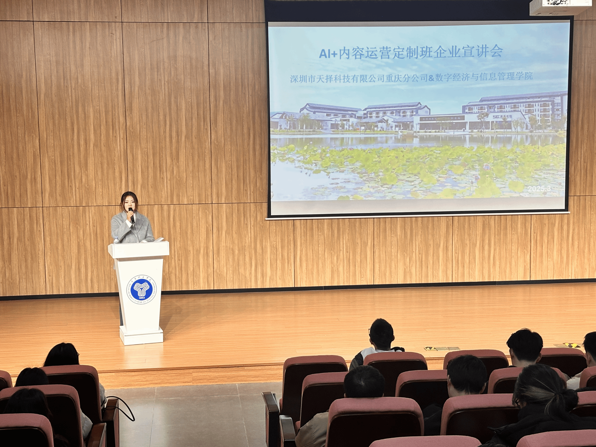 为提升学生对AI工具的认知与应用能力,增强其未来职场的竞争力,为学生搭建前沿技术与职业发展的桥梁,数字经济与信息管理学院与深圳市天择科技有限公司重庆分公司联合举办“AI+内容运营定制班”。2025年3月5日16:00点在贤者楼131,举办了宣讲会。此次活动特别邀请到深圳市天择科技有限公司重庆分公司的负责人张铭作为主讲嘉宾。