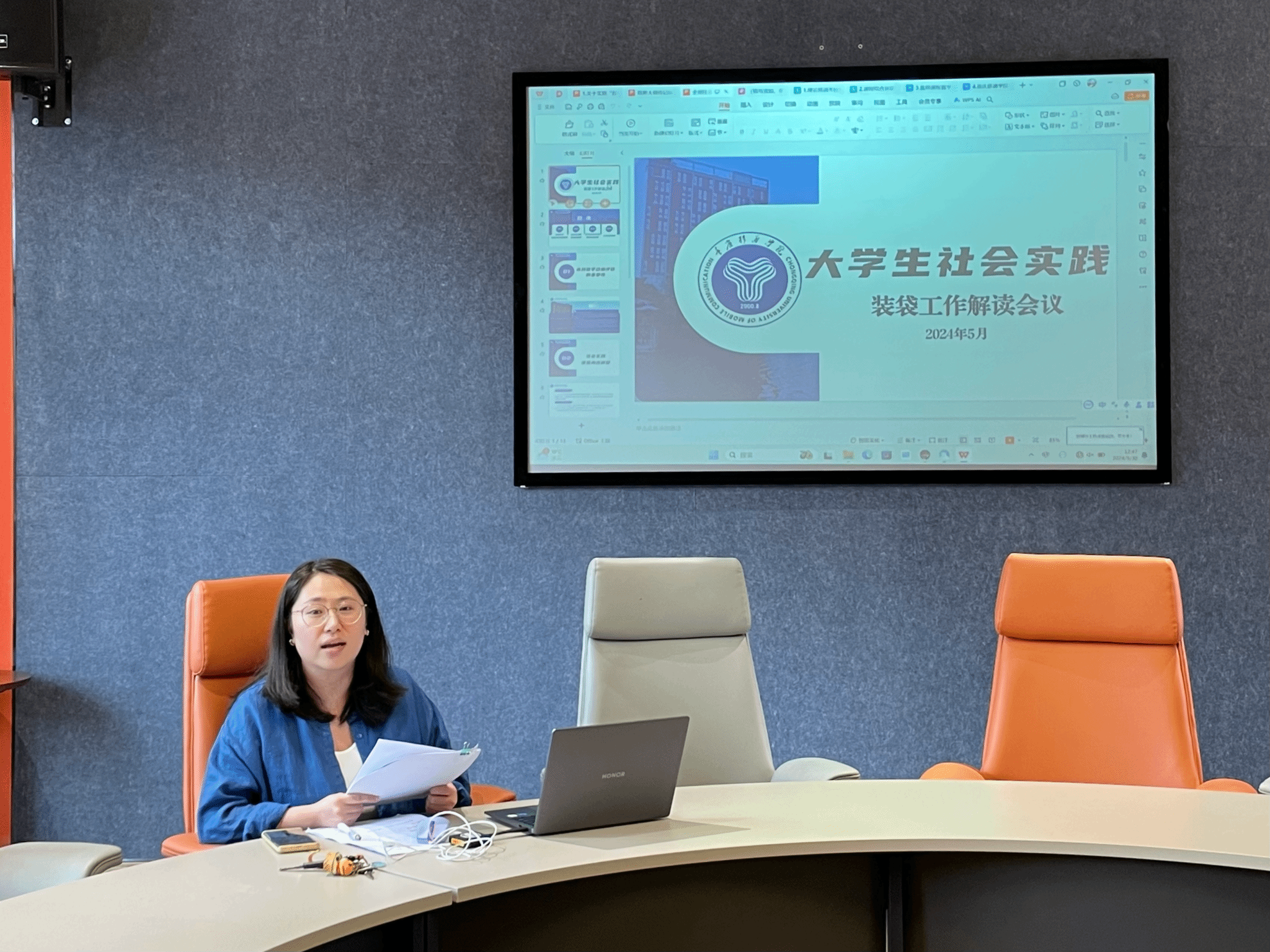随后,戏剧影视学院郭嘉琦老师带领大家深入解析了《大学生社会实践装袋工作解读》相关政策文件。郭老师提到:“因为本科教学合格评估的重要性,社会实践活动演变为社会实践课程,所以社会实践课程的重要性需要向学生们传达。”