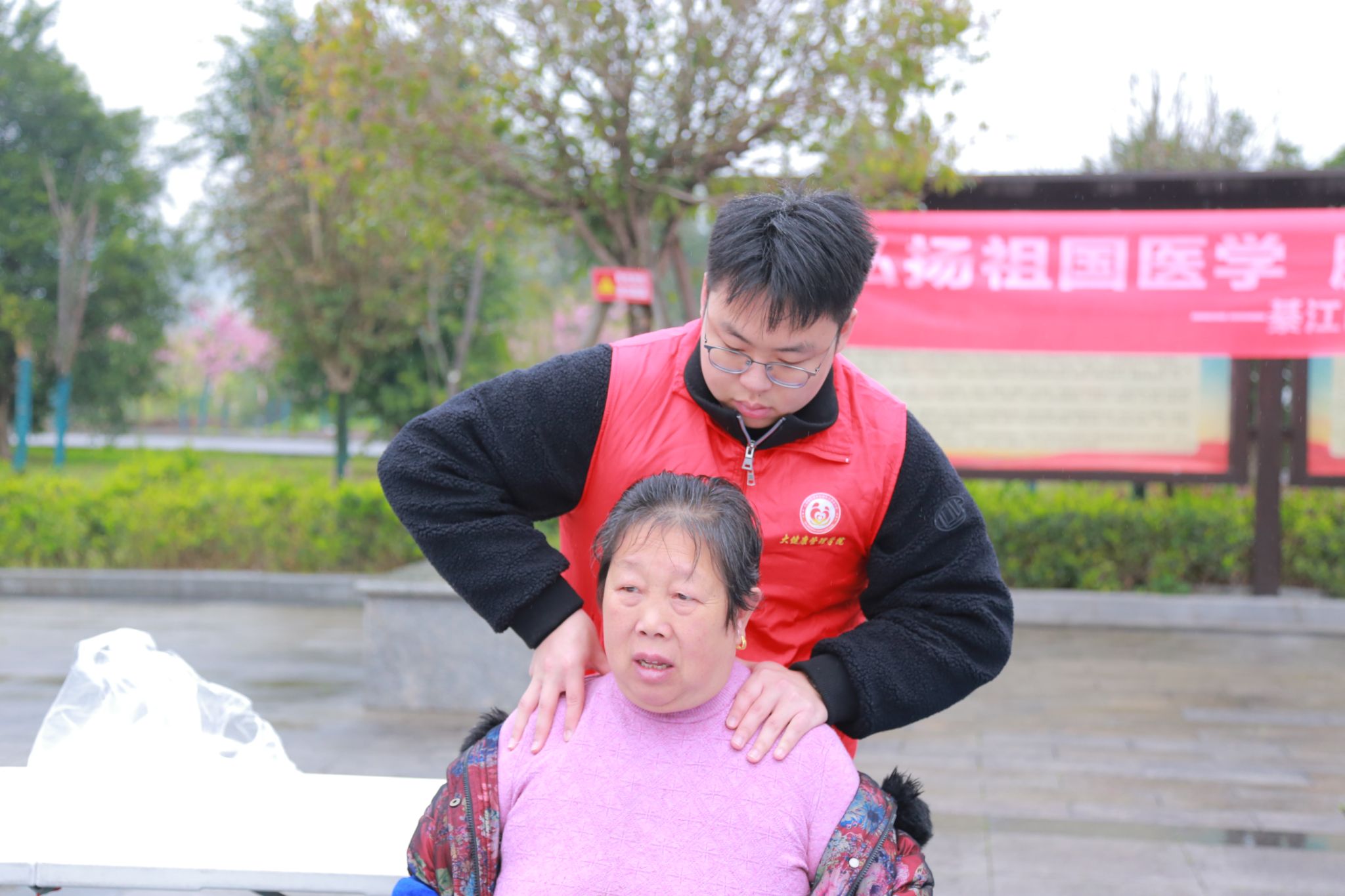 大健康管理学院“向日葵”医护服务志愿服务支队的志愿者们积极加入义诊活动,协助医护团队为居民们进行血压、血糖测量,耐心解答居民各类健康问题,同时也根据自己的所学的专业知识和技能,在现场医师的指导下给社区的老年居民提供中医推拿按摩,把自己的所学融入于社会志愿实践中,用青春活力为社区增添一抹亮色,拉近了医学知识与居民生活的距离。