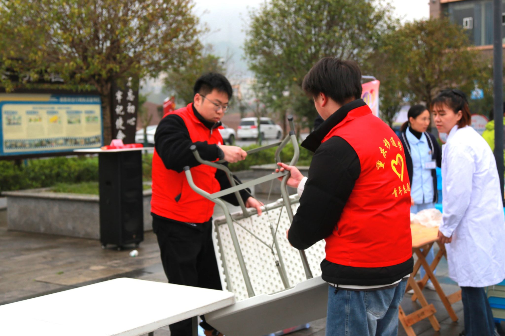 活动现场,大健康管理学院“向日葵”医护服务志愿服务支队的志愿者协助綦江区中医院的医护团队搭建义诊台,面对人流高峰,志愿者们用“微笑提醒+分流引导”化解拥挤,向居民介绍义诊流程。志愿者们主动承担起“专属陪护”任务,搀扶行动不便的老人测量血压,用方言亲切讲解注意事项,为现场活动有序开展提供重要保障。