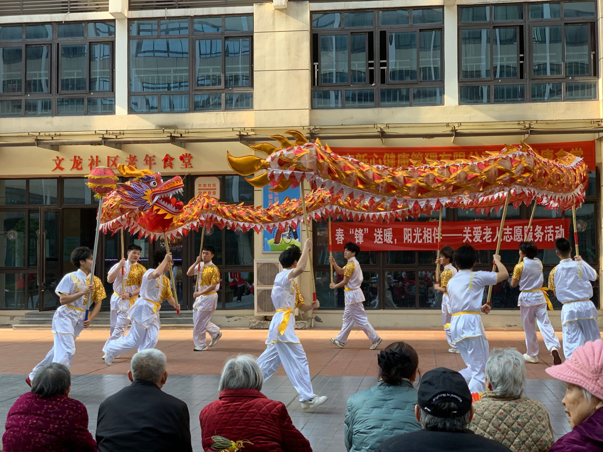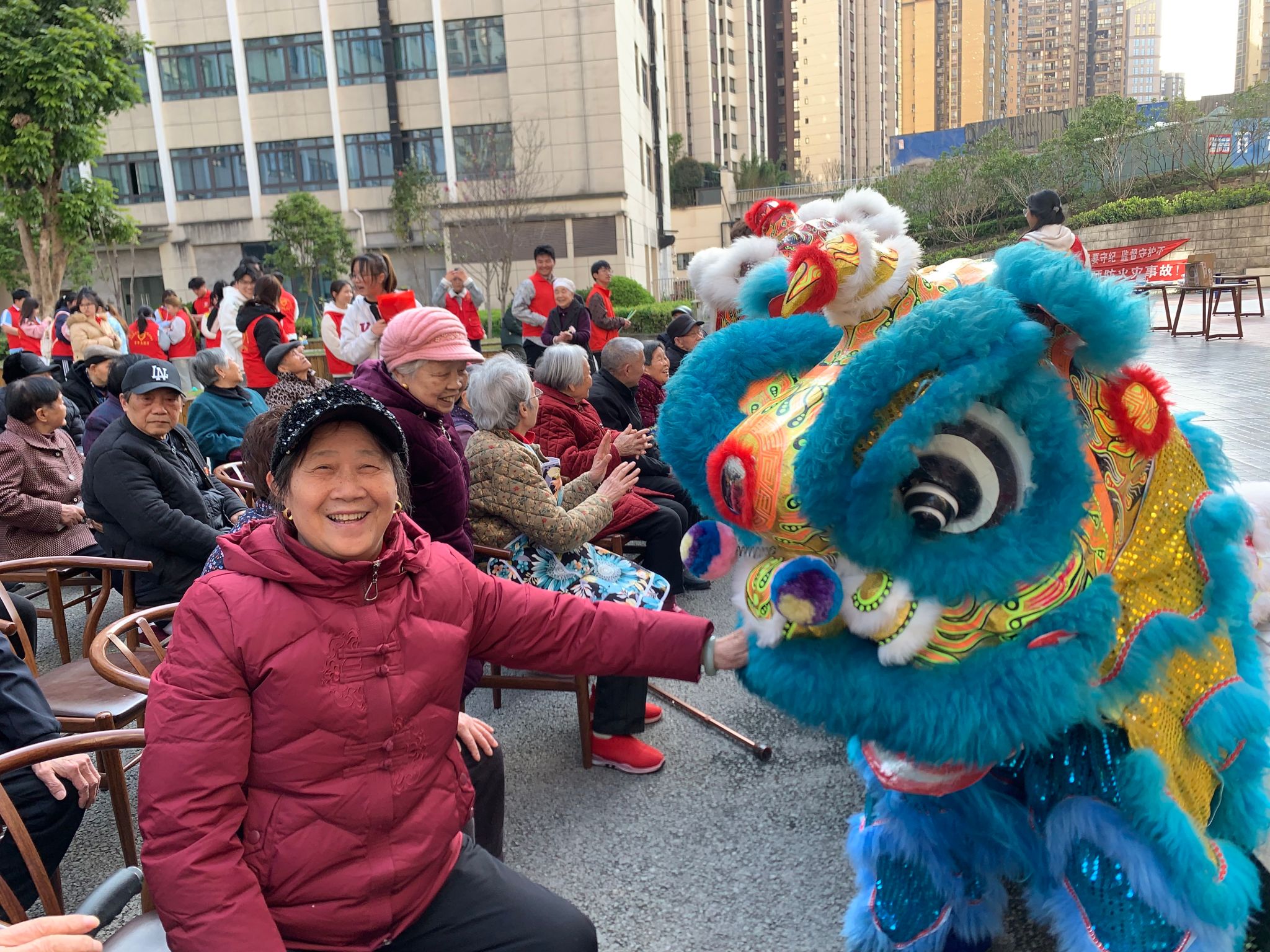 随后,舞龙舞狮社团的同学们为老人们呈上了妙趣横生的民俗表演。活灵活现的舞狮时而俏皮眨眼,时而轻盈跳跃,与老人们进行了温馨亲密的互动,其憨态可掬的模样逗得现场笑声连连。紧接着,一场气势恢宏的舞龙表演震撼上演,只见巨龙在铿锵有力的鼓点伴奏下,时而如蛟龙出海般矫健有力,时而似游龙戏珠般灵动自如,充分展现了中华传统文化的独特韵味与非凡魅力。老人们在这欢声笑语中深切感受着传统文化的深厚底蕴,脸上绽放出幸福满足的笑容,现场充满着温馨与和谐的气氛。