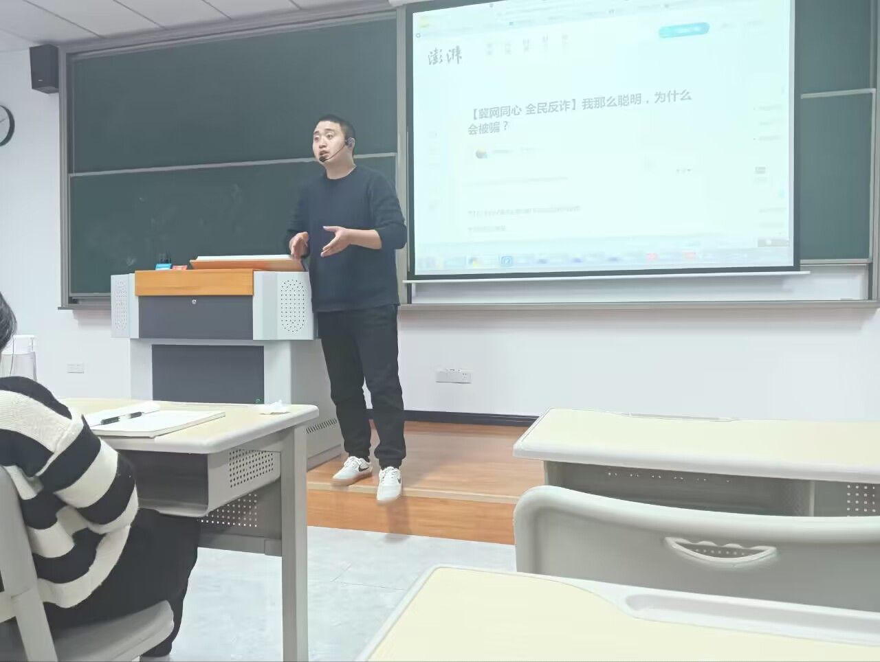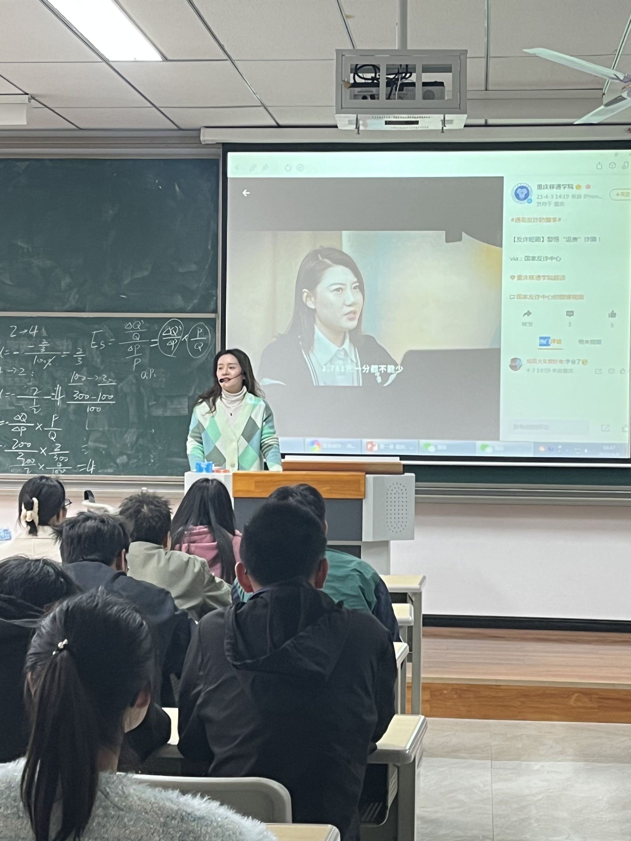 在仁者楼312和智者楼203,冉叶虹老师分别跟2022级互联网金融1-2班和2022级供应链管理3-4班的同学一起利用课间时间开展反诈骗宣传。通过了解当前诈骗问题的大概情况,比如常用的诈骗手段、大学生受骗案例、诈骗成功的概率以及产生了多少损失,逐步提高了同学们识别诈骗、预防诈骗犯罪的能力。
