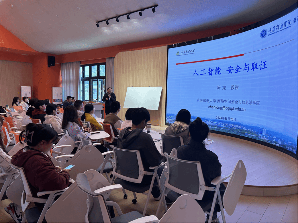 在数字化转型的浪潮中,人工智能正以前所未有的速度改变着我们的生活与工作方式,然而,伴随其广泛应用的同时,人工智能安全与电子数据取证的重要性也日益凸显。为了增强师生对人工智能安全的认识,提升电子数据取证能力,大数据学院于2024年11月20日在古剑书院含光报告厅举办了一场“人工智能安全与取证”专题讲座。此次讲座特邀重庆邮电大学网络空间安全与信息学院陈龙教授作为主讲嘉宾,吸引了大数据学院副院长吕云山副教授、大数据教研室主任李静毅副教授、大数据教研室众多教师以及数据科学与大数据技术专业学生前来聆听。
