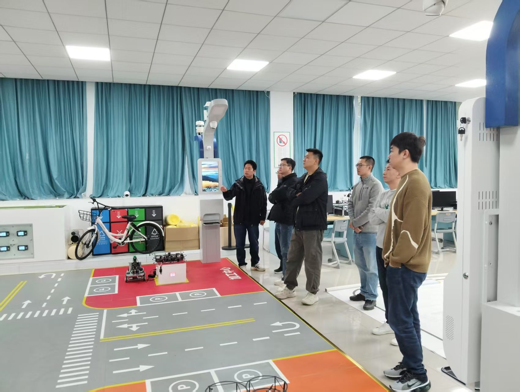 在通信与信息工程学院智能信息技术教研室主任冯文果的陪同下,西南民族大学考察团首先参观了我校智能系统工程实验室。实验室构建了“实体设备-虚拟仿真-场景应用”三位一体的智能技术研训平台,配备人形机器人、智慧农业物联网、AI垃圾分类识别系统和自动驾驶车路协同装置等核心设备。冯老师详细介绍实验室:“我们的实验室不仅服务于日常教学,还承担了机器人竞赛等。人工智能实验室已支撑《智能系统设计》、《智能机器人》、《毕业设计》等多门课程项目化教学,并衍生出智能机器人、智能复合体、工业缺陷检测等多个竞赛课题。”近两年累计获得包含国家一等奖等十余项国家级奖项,省级以上奖励三十余项,实现教学与竞赛的深度互哺。