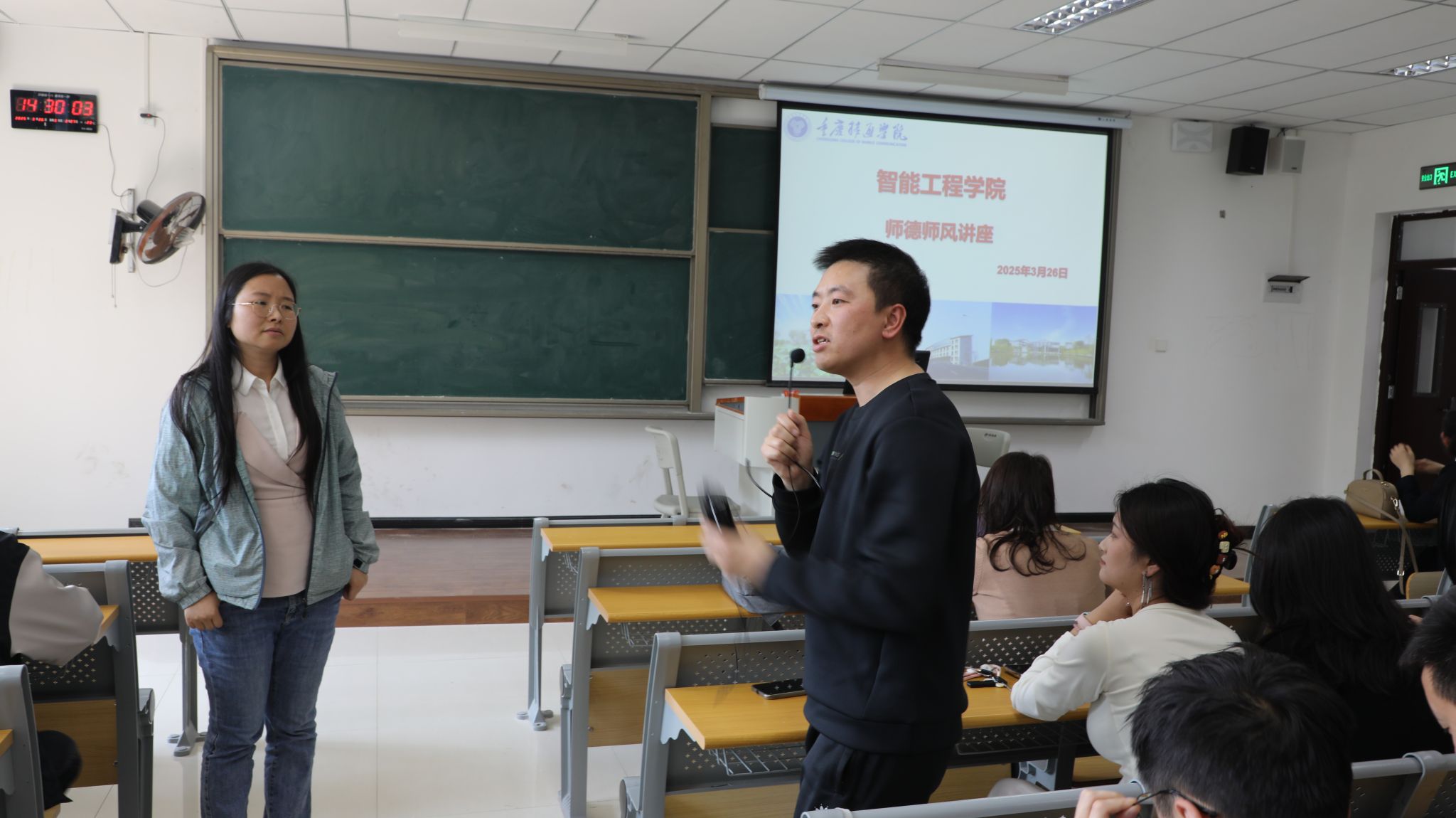 为深入贯彻落实新时代教师职业行为准则,强化师德师风建设,持续推进教育部关于高校教师师德师风建设工作的部署要求,加强对教职工教书育人的思想价值引领,3月26日14:00,智能工程学院在9201举办“树师德·扬师风”专题教育讲座。本次讲座由智能工程学院教师党支部书记王瑞芳老师担任主讲,学院副院长李洁主持会议,全院教师及辅导员队伍参与本次专题讲座。