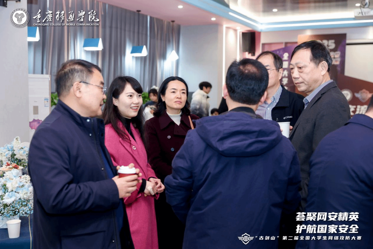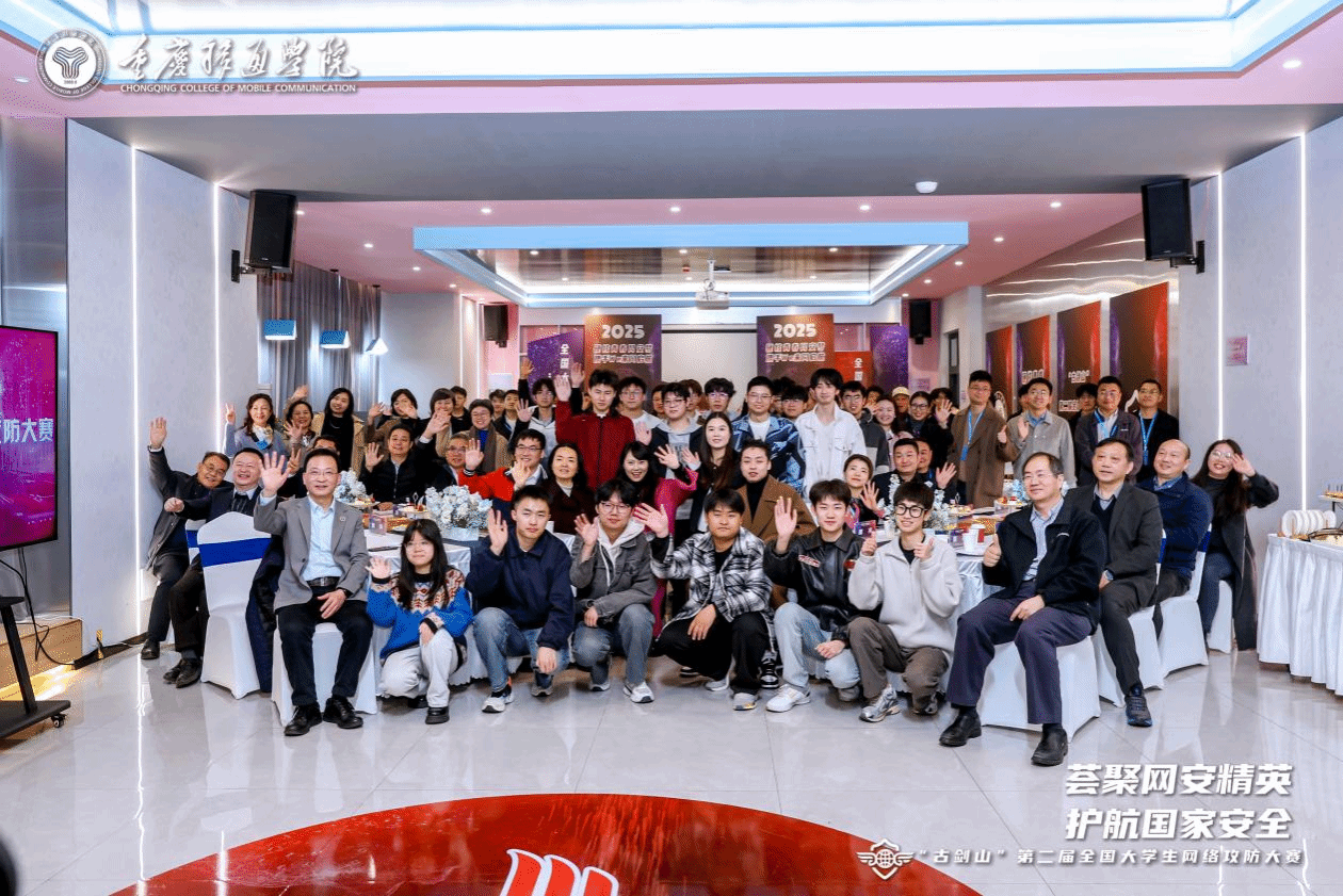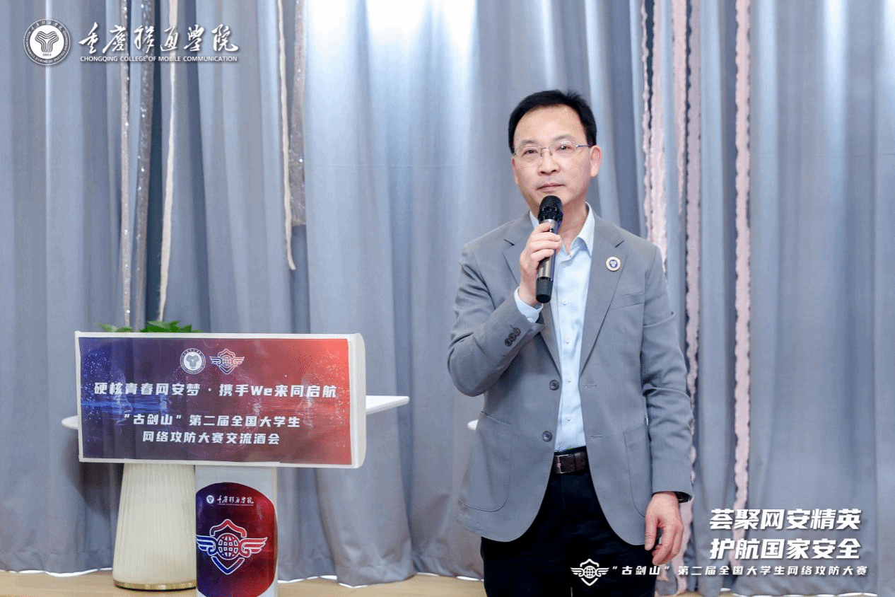 2025年3月29日下午,由中共重庆市委网络安全和信息化委员会办公室、重庆市数据安全工作协调机制、重庆市教育委员会、中国共产主义青年团重庆市委员会、重庆市綦江区人民政府作为指导单位,重庆移通学院主办,奇安信科技集团有限公司提供技术支持的“古剑山”第二届全国大学生网络攻防大赛决赛成功举办。为给参赛选手营造一个轻松愉快的交流氛围,加强选手、嘉宾之间的互动与联系,大赛组委会在丁山书院举办了以“硬核青春网安梦,携手We来同启航”为主题的交流酒会活动。来自全国各地的参赛师生、嘉宾以及各位领导齐聚一堂,共同分享网络安全领域的实践经验、前沿见解,探讨行业发展新趋势。