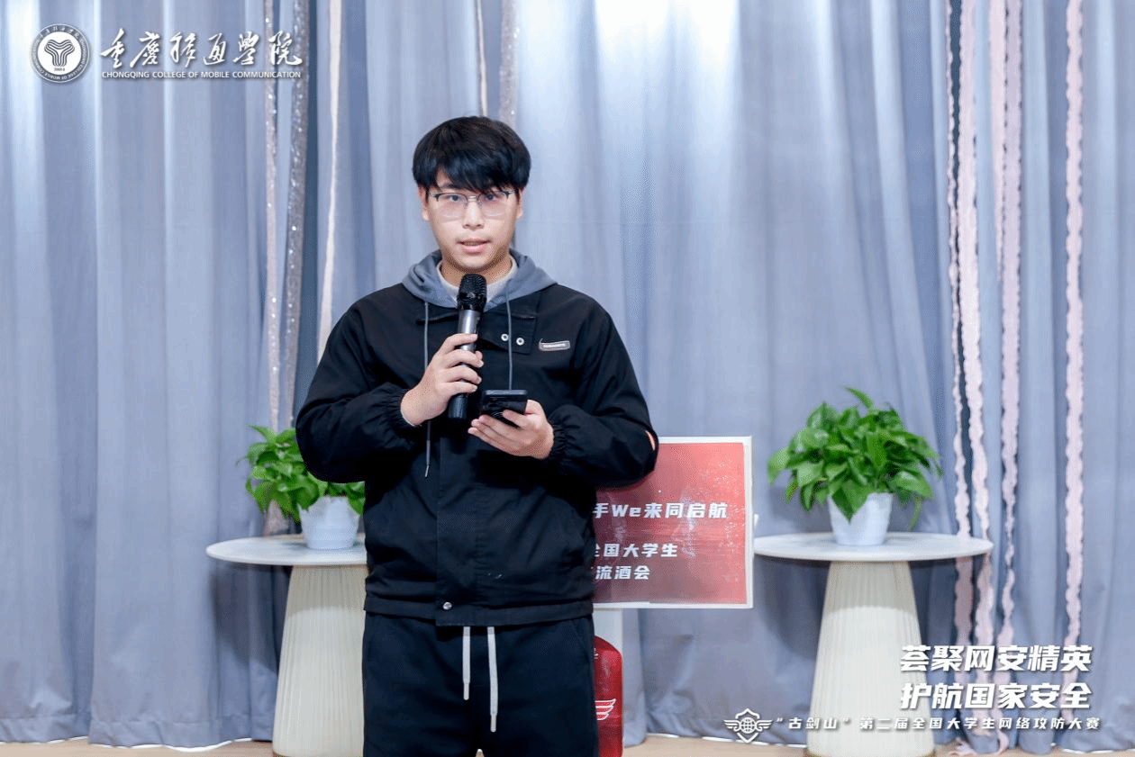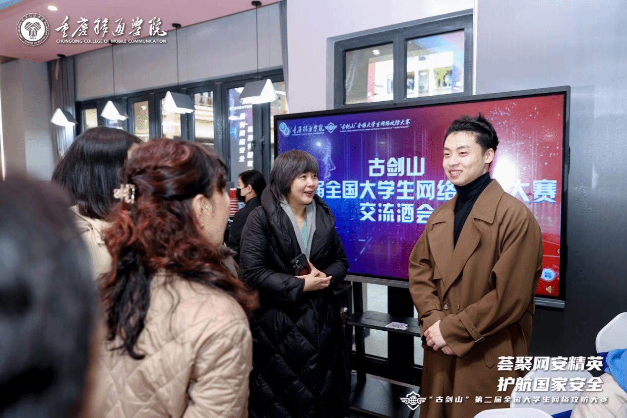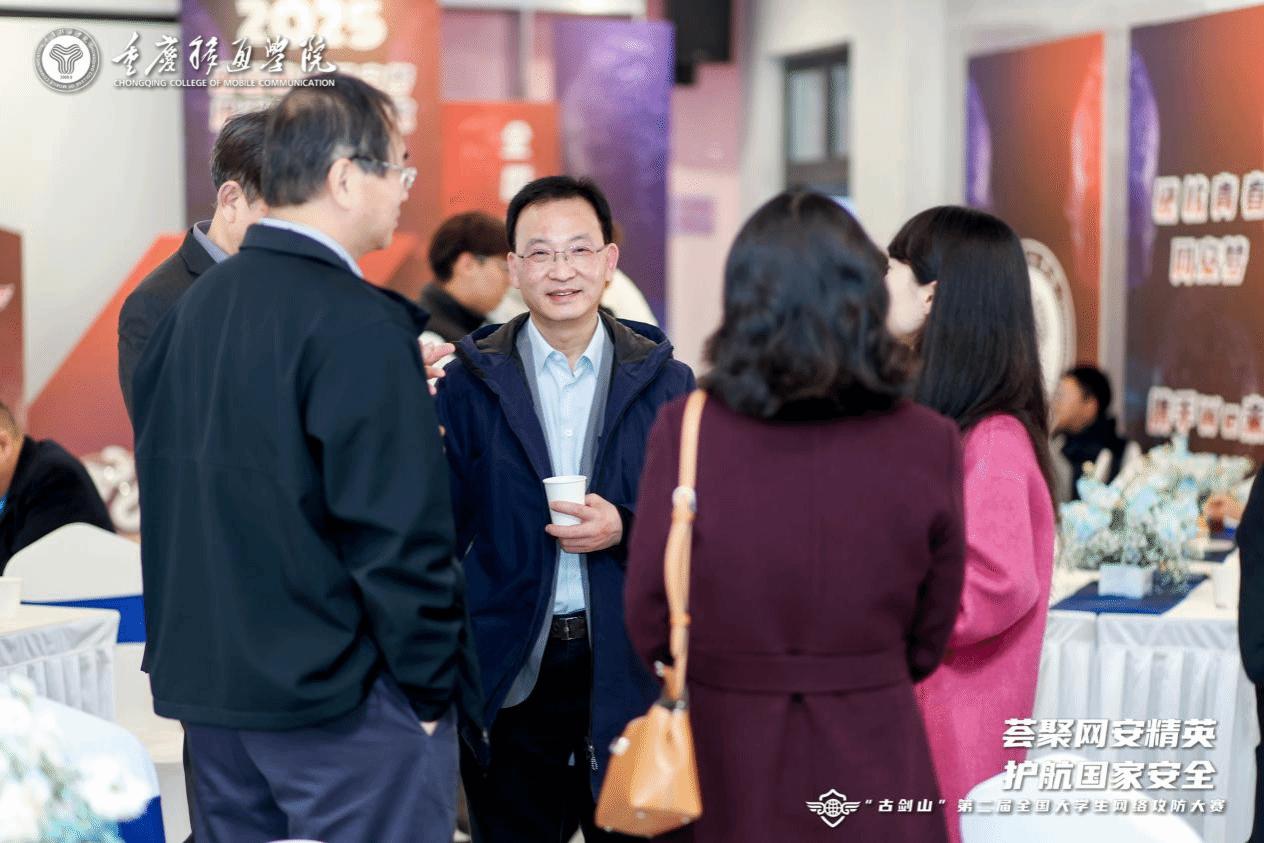 2025年3月29日下午,由中共重庆市委网络安全和信息化委员会办公室、重庆市数据安全工作协调机制、重庆市教育委员会、中国共产主义青年团重庆市委员会、重庆市綦江区人民政府作为指导单位,重庆移通学院主办,奇安信科技集团有限公司提供技术支持的“古剑山”第二届全国大学生网络攻防大赛决赛成功举办。为给参赛选手营造一个轻松愉快的交流氛围,加强选手、嘉宾之间的互动与联系,大赛组委会在丁山书院举办了以“硬核青春网安梦,携手We来同启航”为主题的交流酒会活动。来自全国各地的参赛师生、嘉宾以及各位领导齐聚一堂,共同分享网络安全领域的实践经验、前沿见解,探讨行业发展新趋势。