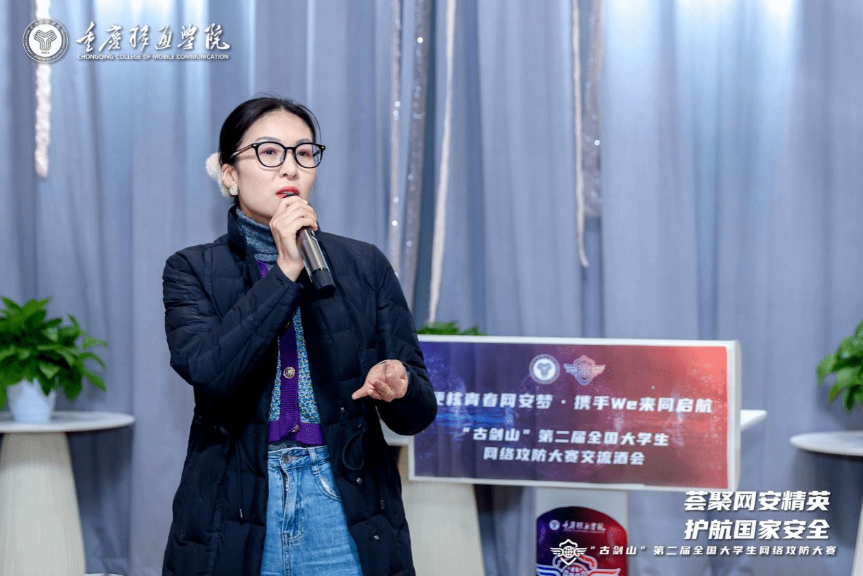 紧接着重庆移通学院“綦剑网盾1队”战队的指导教师崔向灵作为指导教师代表进行发言。她指出,当下网络安全领域发展迅猛,技术迭代快,传统纯理论教学已无法满足行业需求,只有让学生置身于真实的网络安全场景中,经历各类实操项目的打磨,才能真正实现理论与实际操作的深度融合,培养实战性网络安全人才。