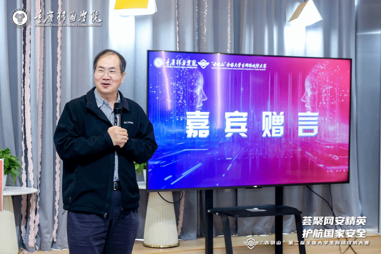 随后,东南大学的首席教授、新加坡南洋理工大学终身教授黄广斌以大赛特邀嘉宾身份发表赠言。黄教授指出,人工智能的迅猛发展正强烈冲击网络安全领域,此次大赛实现了“人与人”的攻防对抗,未来“人与机器”的较量或许才是常态,网络安全的重要性愈发凸显。他强调,网络安全技术人才虽拥有广阔的发展前景,但对应的知识结构和承担的责任也更大。他表示在当前背景下,重庆移通学院主办“古剑山”网络安全攻防大赛意义重大,为学生提供了实战演练的机会,而此次交流酒会更是打破了院校、企业以及参赛队伍间的沟通壁垒,让不同思维碰撞交融,为网络安全领域的长远发展筑牢根基。