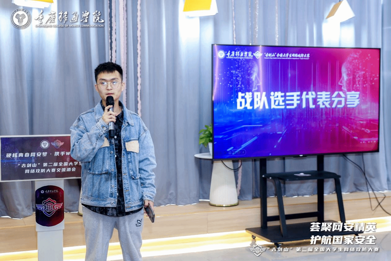 指导教师代表发言结束后,迎来了备受期待的参赛选手参赛分享环节。首先是宁波工程学院的“泥巴睡觉战队”的尹铭宇。尹铭宇表示参与此次大赛对战队而言是一次意义非凡的经历,在激烈的赛事角逐中让他们深刻体会到了团队合作的重要性,通过此次比赛不仅让他们收获了知识和技能,还在赛场内外结识了众多志同道合的朋友,个人能力也得到了提升。随后,成都东软学院“PKWSec战队”的董梦博表示,他对重庆移通学院提供的平台表达了由衷感激,认为这是一次难得的机会,让他们得以充分展现自身技能。同时他提到此次比赛不仅是技能的较量,更是知识与经验的汇聚,他也从其他战队汲取了许多宝贵经验,这些收获将激励他在网络安全学习之路上不断砥砺前行。