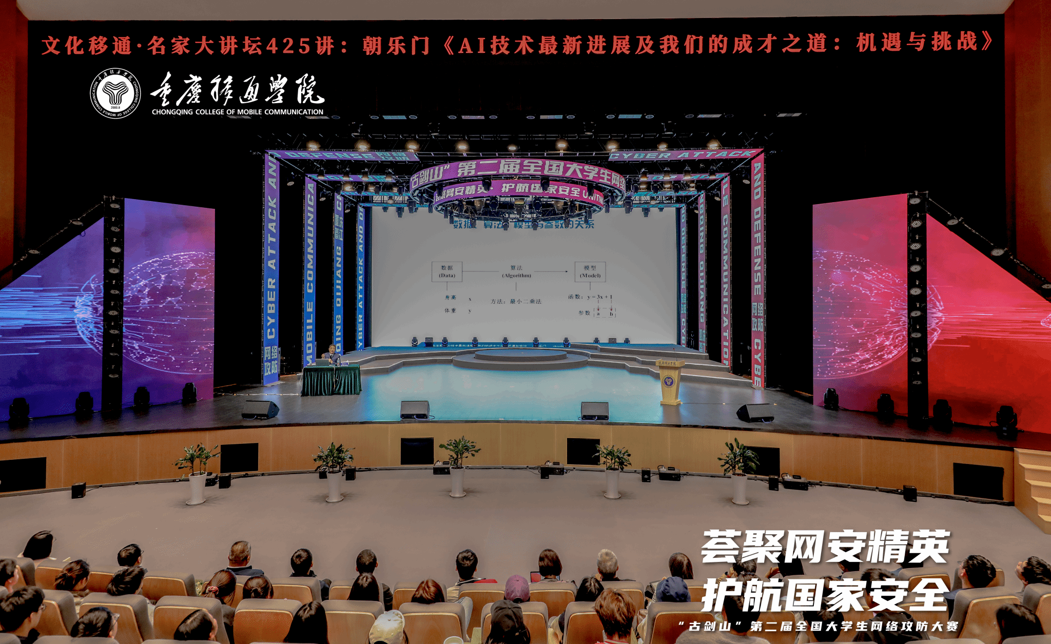 随着“古剑山”第二届全国大学生网络攻防大赛活动周的深入推进,2025年3月28日下午14:00-16:00,一场以《AI技术最新进展及我们的成长之道:机遇与挑战》为主题的名家大讲坛活动在重庆移通学院綦江校区綦艺大剧院隆重举行,内容聚焦人工智能技术革新与AI时代人才能力构建。本次活动特邀中国人民大学朝乐门教授担任主讲嘉宾,中国青年报社文化中心主任姜蕾、中国青年报社媒体策划部主任陈醒、中国青年报社媒体策划部编辑李楠、中经社北京中心主任助理王婷婷、集团高级副总裁张亮、常务副校长王永周、副校长李文豹、校长助理张平等领导及众多学院师生共同出席。