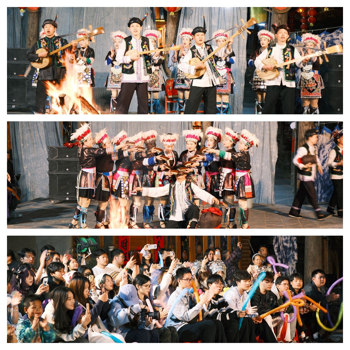 师生团队抵达第二日便参与了侗族篝火晚会,侗族的篝火晚会是侗族人民庆祝节日、增进感情的重要传统活动,也是他们与游客互动、传递热情的重要形式。侗族姑娘和小伙子们会与宾客一起围绕篝火载歌载舞,场面欢乐,气氛热烈。师生们现场感受了“人类非遗”侗族大歌的多声部混唱魅力。在义团鼓楼前,非遗传承人陆艳玉带领学生们围坐火塘,以《蝉之歌》《布谷催春》等经典曲目展现侗族与自然共生的哲学。侗戏《珠郎娘美》的古朴表演形式,则为戏剧影视文学专业学生提供了鲜活的创作素材。“当侗族大歌的第一个音符飘出来时,我感觉自己像被一股无形的力量击中了,原来侗族大歌空灵悠扬的吟唱是这样的感觉,传统音乐和现代艺术的结合可以如此美妙,为叙事提供了一种富有节奏的美感。”2023级戏剧影视文学专业学生廖梓君和在座的同学们分享道。