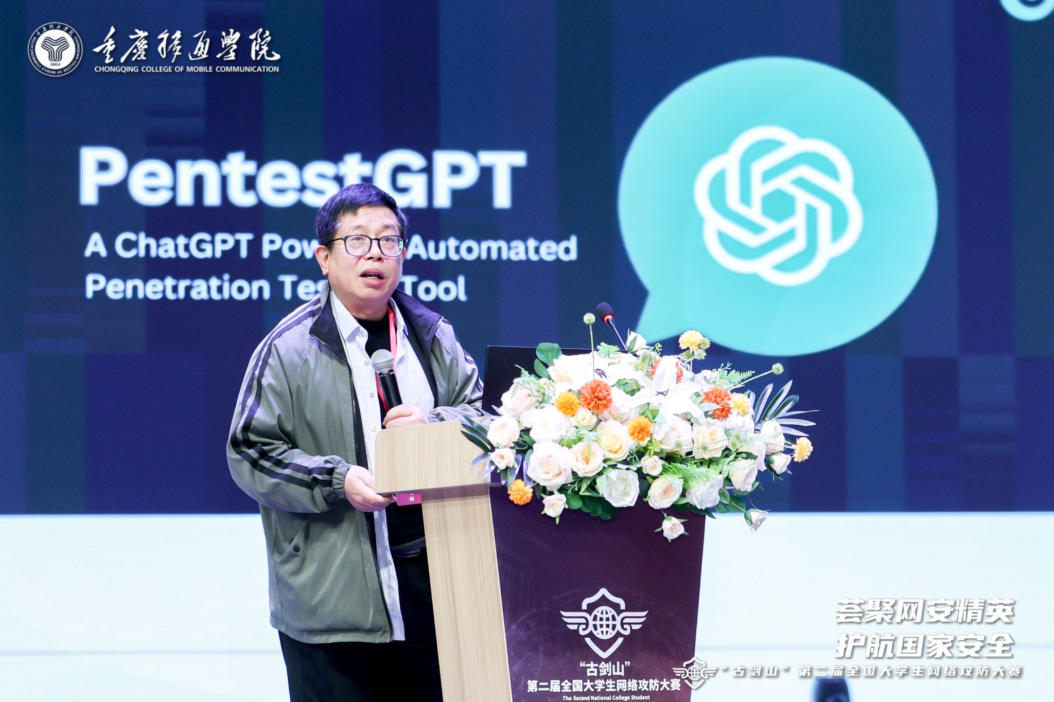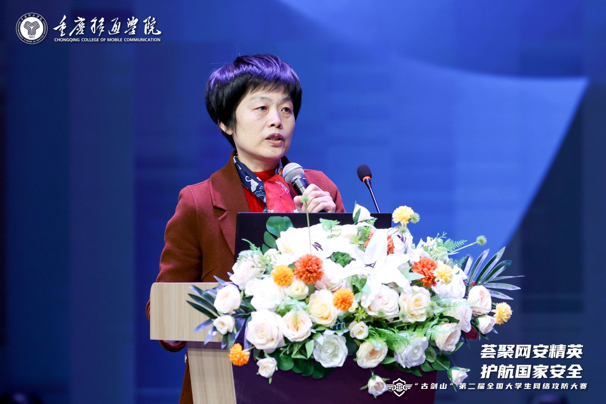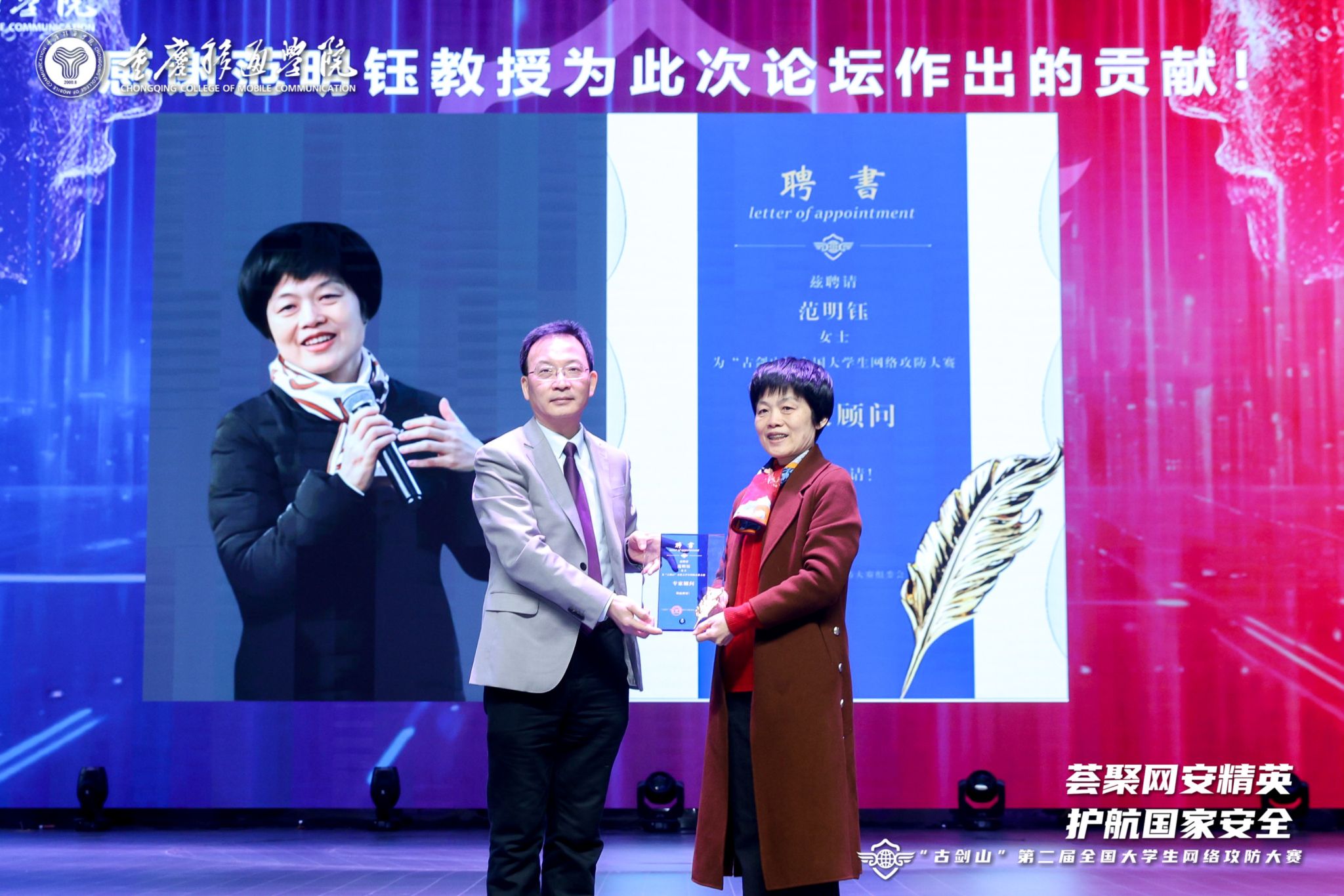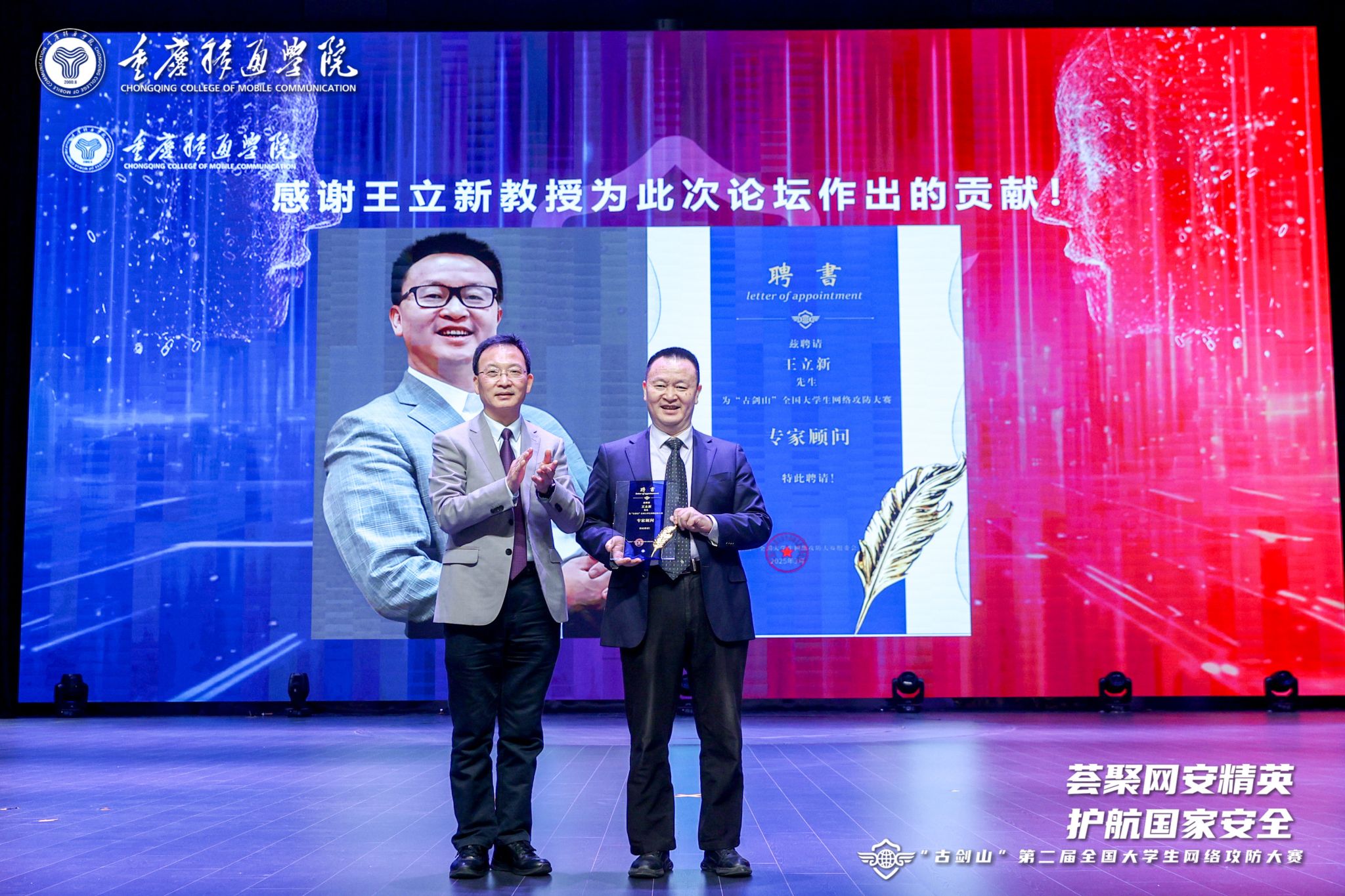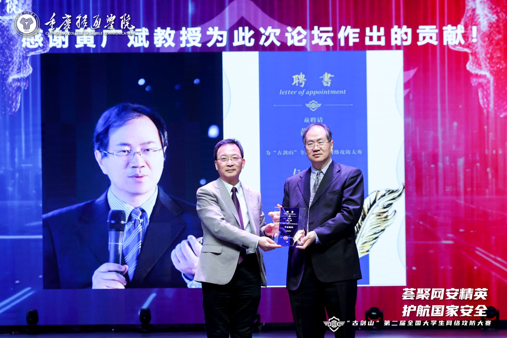 嘉宾演讲结束后,重庆移通学院校长吕翊代表大赛组委会,向黄广斌、李建华、范明钰、王立新四位教授颁发“古剑山”全国大学生网络攻防大赛专家顾问聘书,以此感谢四位专家对大赛活动周给予的支持和帮助。