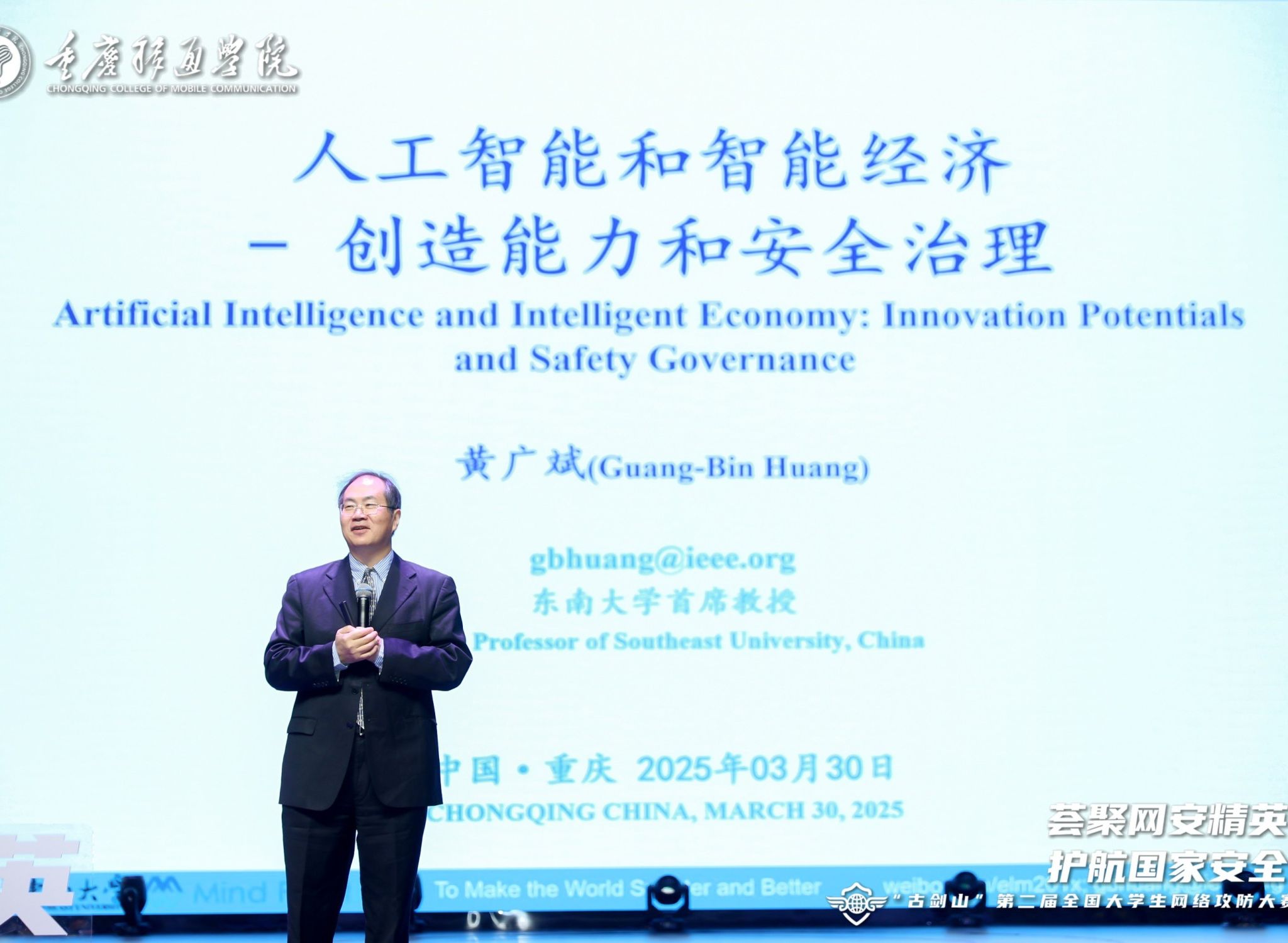 致辞结束后,黄广斌教授首先发表了主题为《人工智能和智能经济:安全治理和创新能力》的演讲。他指出,强大的计算能力、海量数据和高效算法共同推动了机器学习时代的到来,而超限学习机(ELM)等创新理论为人工智能提供了高效的解决方案。黄教授还提到,人工智能正在从“以人为主,AI辅助”逐步转向“以AI为主,人类辅助”,并已在医疗、航天等领域展现出巨大潜力。他强调,如果人工智能的发展不受控,可能对人类文明和地球总体智能产生深远影响。因此,要加强对人工智能的安全治理,确保技术进步能够真正造福人类。这场演讲不仅为人工智能的未来发展提供了深刻洞见,也引发了关于技术伦理与治理的广泛思考。