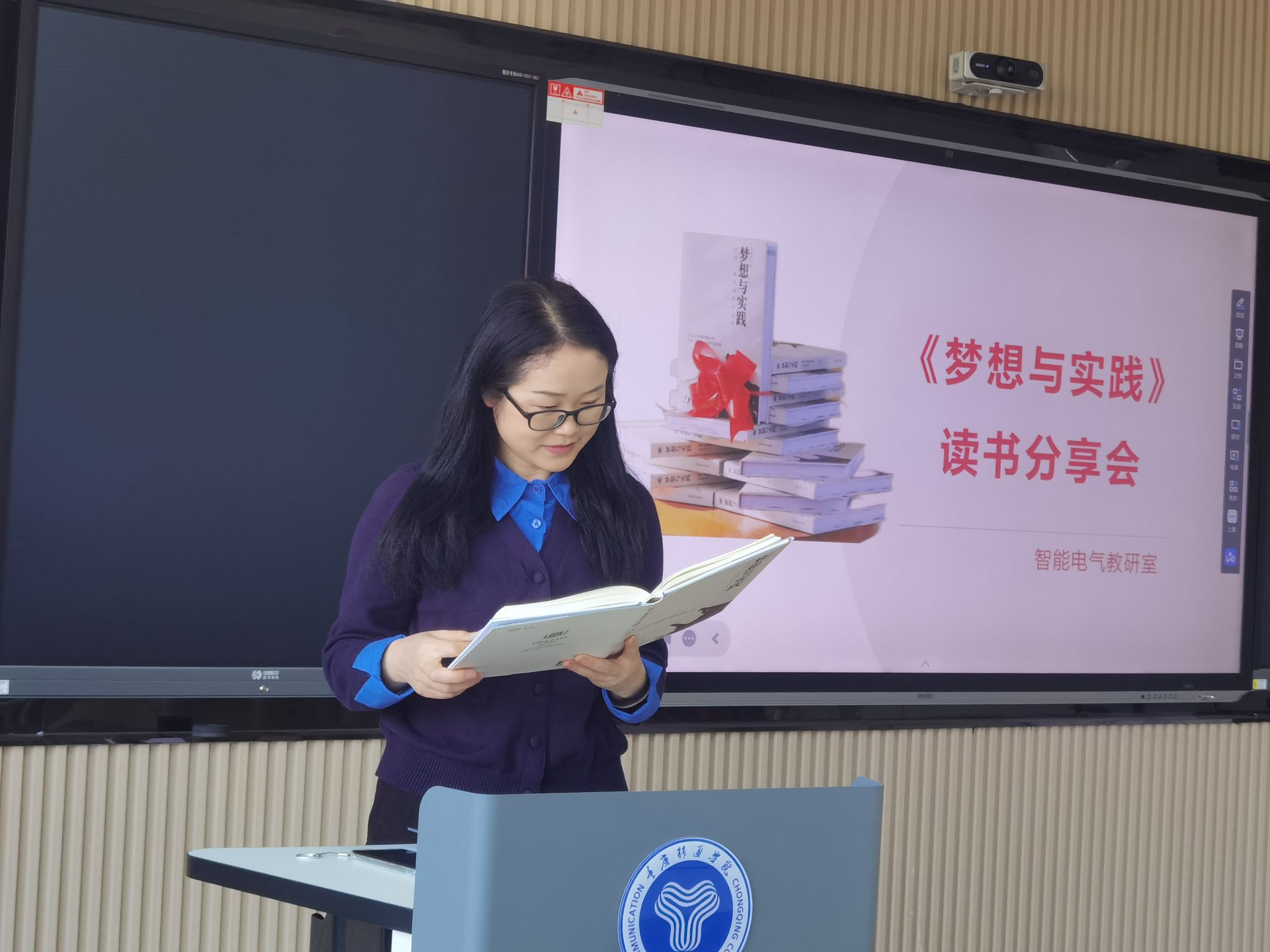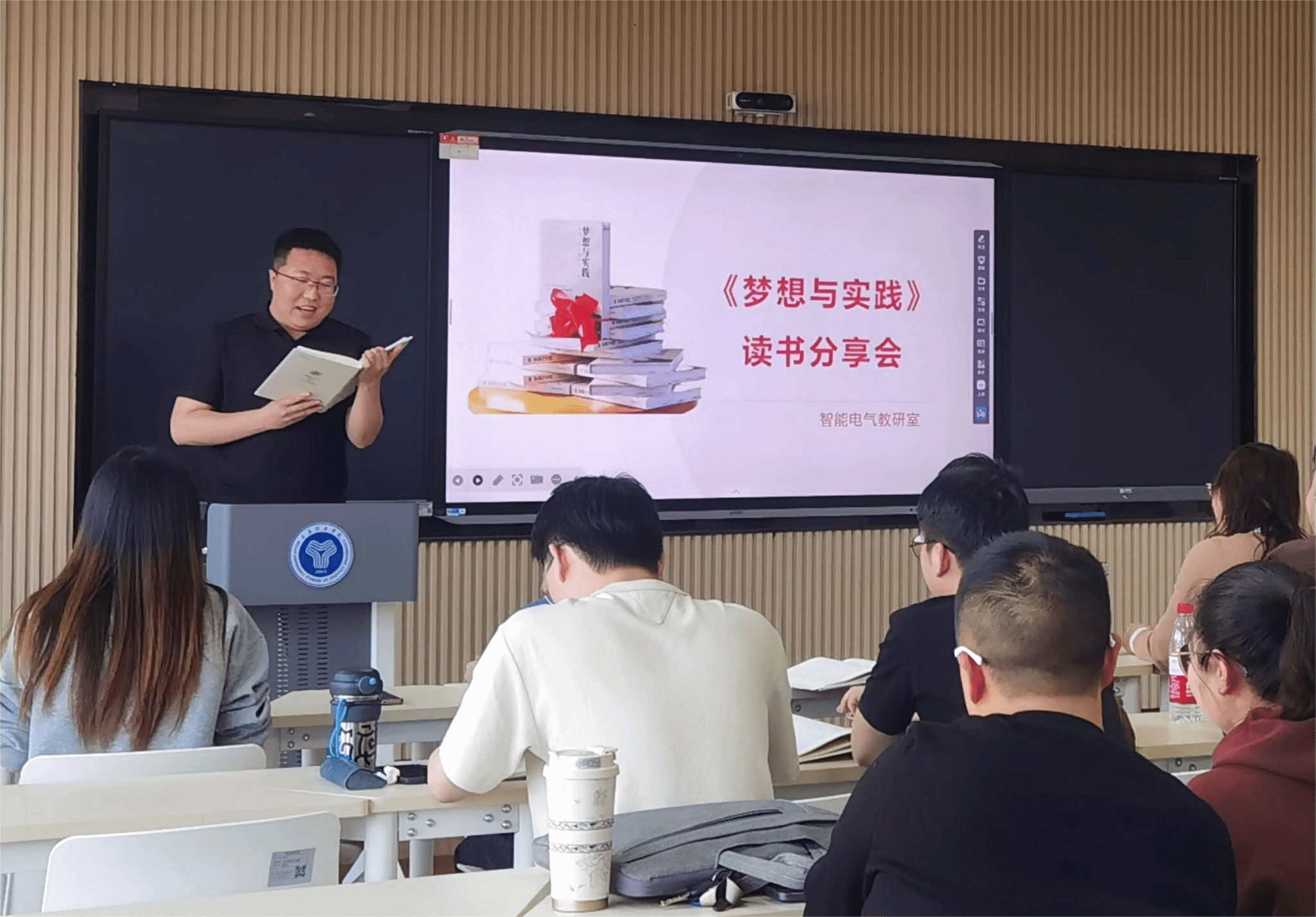智能电气教研室组织教研室全体教师在9112成功开展了一场深入学习彭鸿斌董事长《梦想与实践》一书的读书分享会。教研室主任晁晓洁老师首先介绍了深入学习《梦想与实践》这本书的重要性,要求老师们要切实贯彻彭鸿斌董事长办学理念,注重联系实际,将学习内容中体现的精神与自身工作和学习紧密结合起来,做到学以致用。随后,张超宇、付雪峰、董蕾三位老师依次上台,结合自身的阅读体会与教学实践,进行了精彩的分享。张超宇老师以书中关于完满教育的探讨为切入点,结合自己的教学实践,分享了如何在教学中激发学生的梦想意识,引导他们将梦想转化为实际行动;付雪峰老师则从教育理念的角度出发,探讨了《梦想与实践》中提出的“四位一体双院制+特色课程”理念在专业教学中的应用。通过生动的案例,展示了如何将理论知识与实践操作相结合,培养学生的创新思维和解决实际问题的能力;最后,董蕾老师以个人的成长经历为例,分享了阅读《梦想与实践》后对自己教育理念的深刻影响。
