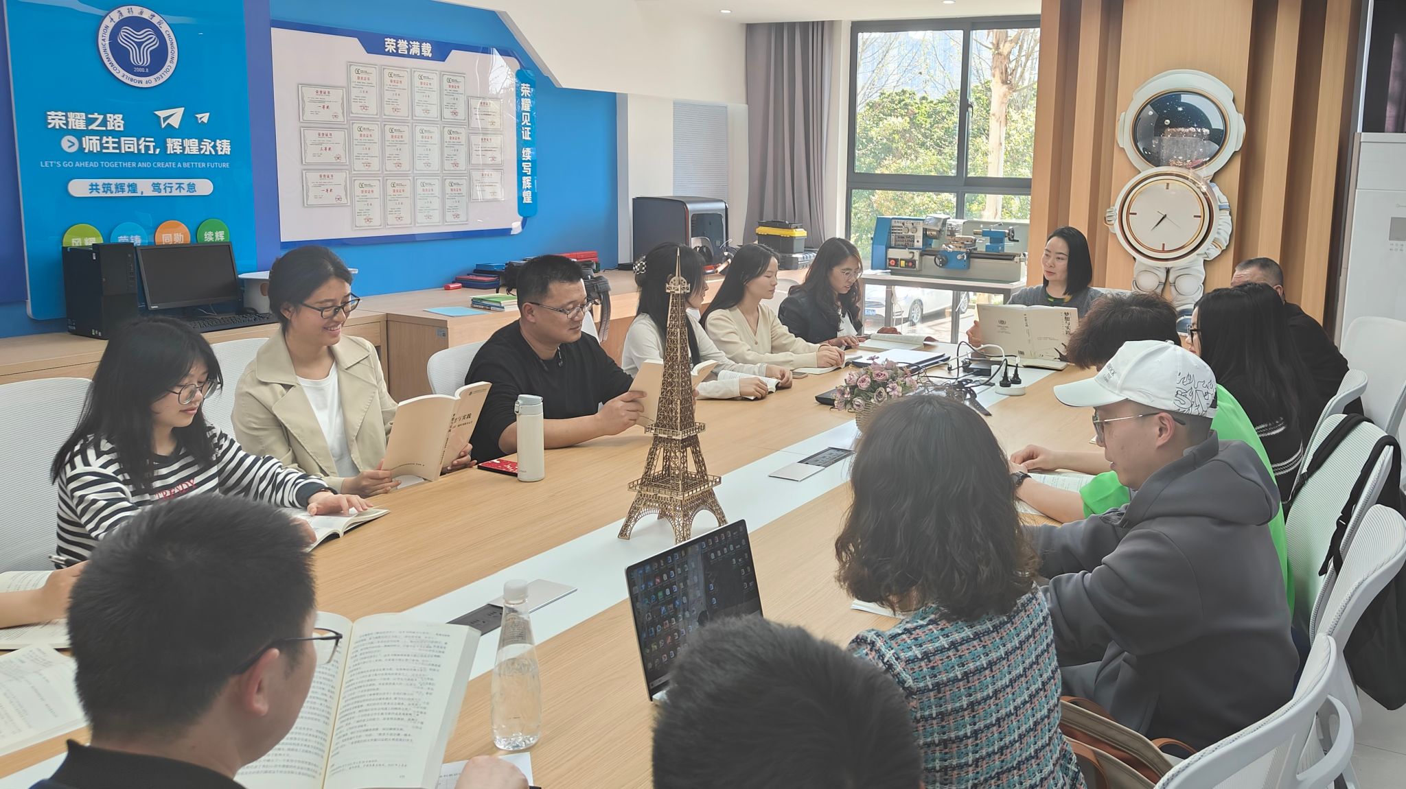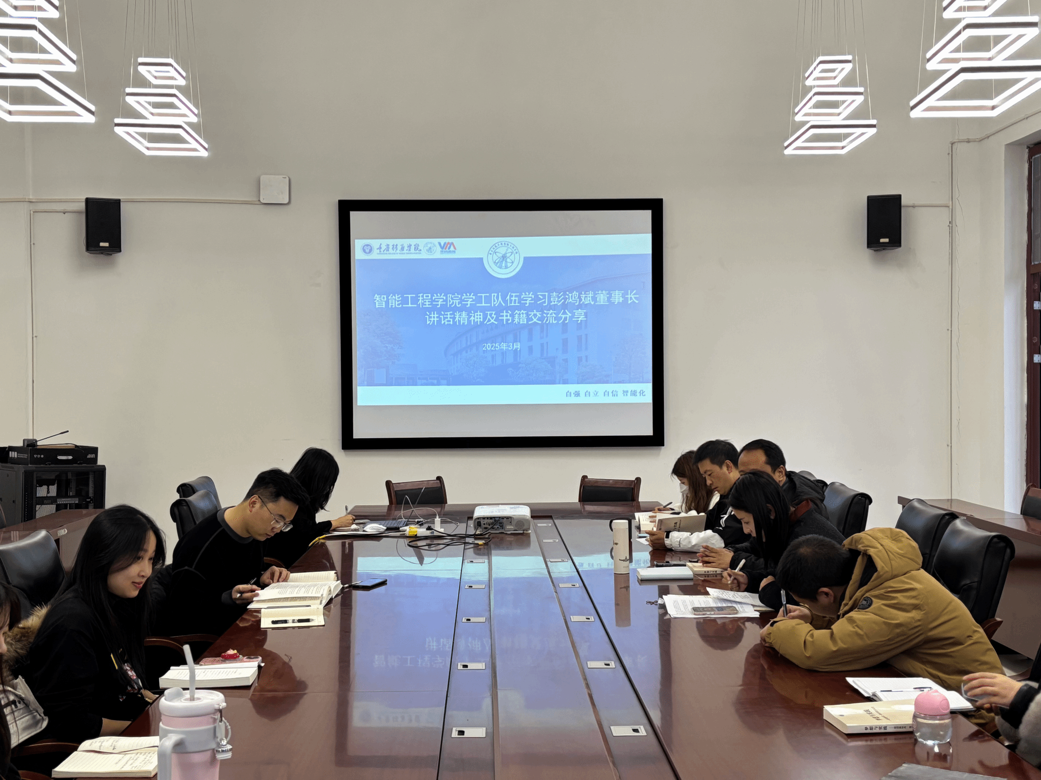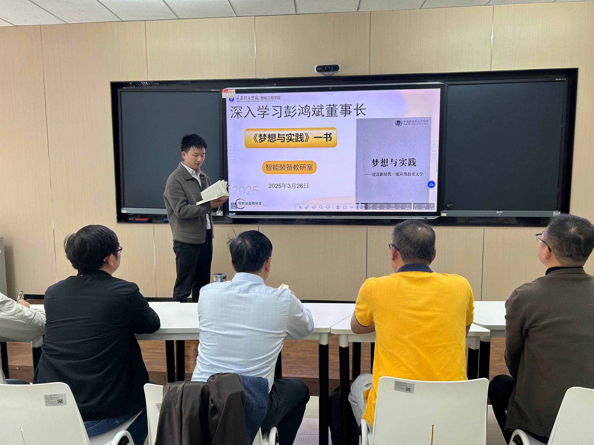 智能装备教研室全体教师在教研室主任刘艳平老师的带领下,于9101教室集中学习了彭鸿斌董事长所著《梦想与实践》一书的核心内容。此次学习活动旨在深化教师对学校办学理念的理解,进一步凝聚教育共识,提升教学育人水平。《梦想与实践》一书深刻阐述了重庆移通学院特色育人模式,实现“生活在书院,专业在学院”的育人生态,旨在实现学生德、智、体、美、劳全面发展。将学生培养置于多元融合的教育生态中,使专业学习与人格塑造相辅相成,生活体验与价值引导紧密结合。学校以“信息产业商学院”为办学定位,主动服务数字经济时代的发展需求,致力于培养数字经济时代具备高情商的经营管理者。