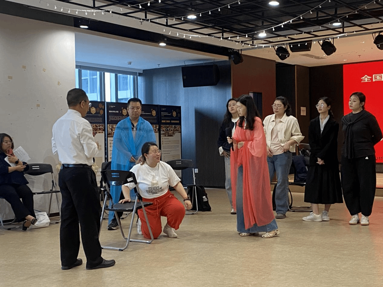 培训突破传统讲座模式,采用“全员共创+小组实战”的沉浸式学习法。全体教师在詹教授指导下,围绕“当前最困惑的问题”展开即兴创作,逐步构建完整剧目。随后,参训教师分组进行编创、彩排与展演,并结合灯光、音乐、道具等舞台元素完成录制。这种“做中学”的模式让老师们深刻体会到心理情景剧的疗愈力量。